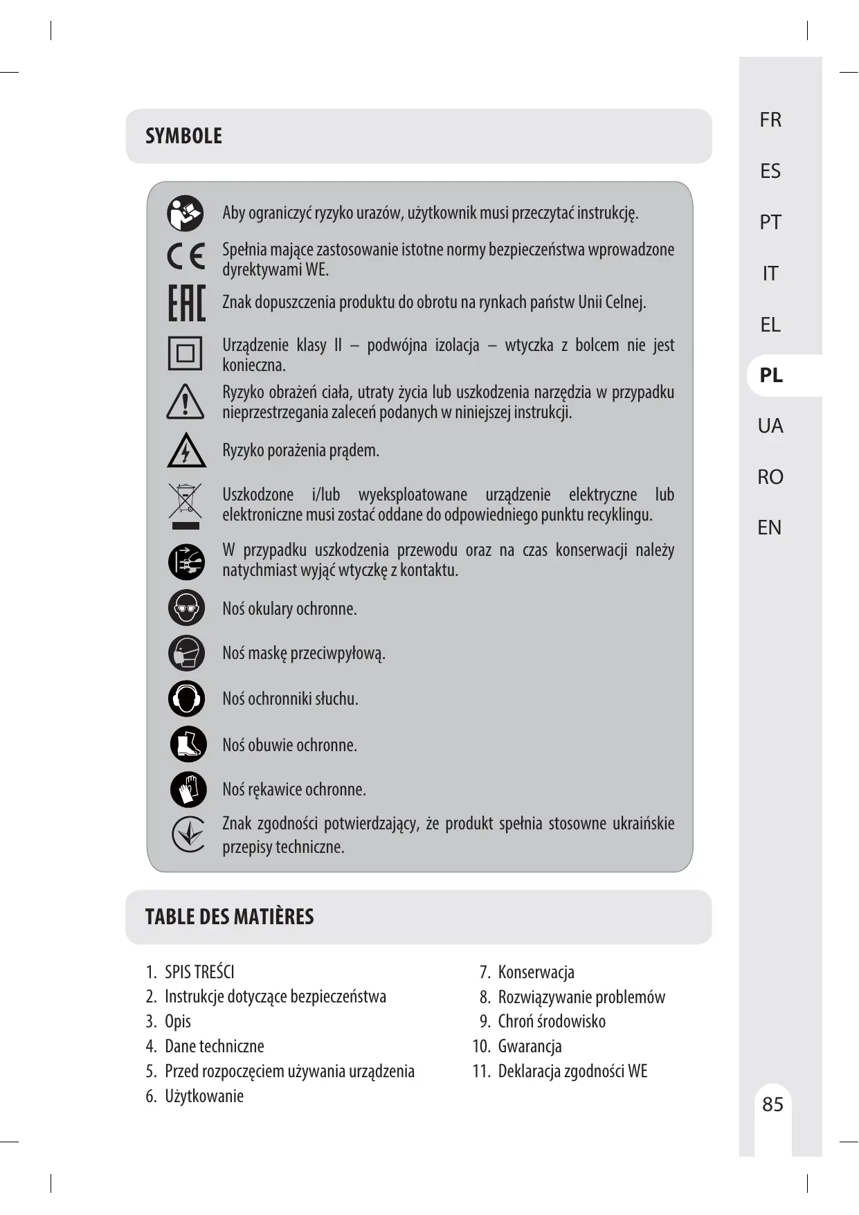 électrique. En cas de dommages, faire réparer l'outil électrique avant de IT l'utiliser. De nombreux accidents sont dus à des outils électriques mal entretenus. f) Garder affûtés et propres les outils permettant de couper. Des outils destinés à EL couper correctement entretenus avec des pièces coupantes tranchantes sont moins susceptibles de bloquer et sont plus faciles à contrôler. PL g) Utiliser l'outil électrique, les accessoires et les lames etc., conformément à ces instructions, en tenant compte des conditions de travail et du travail à UA réaliser. L'utilisation de l'outil électrique pour des opérations différentes de celles prévues peut donner lieu à des situations dangereuses. RO h) Il faut que les poignées et les surfaces de préhension restent sèches, propres et dépourvues d'huiles et de graisses. Des poignées et des surfaces de préhension EN