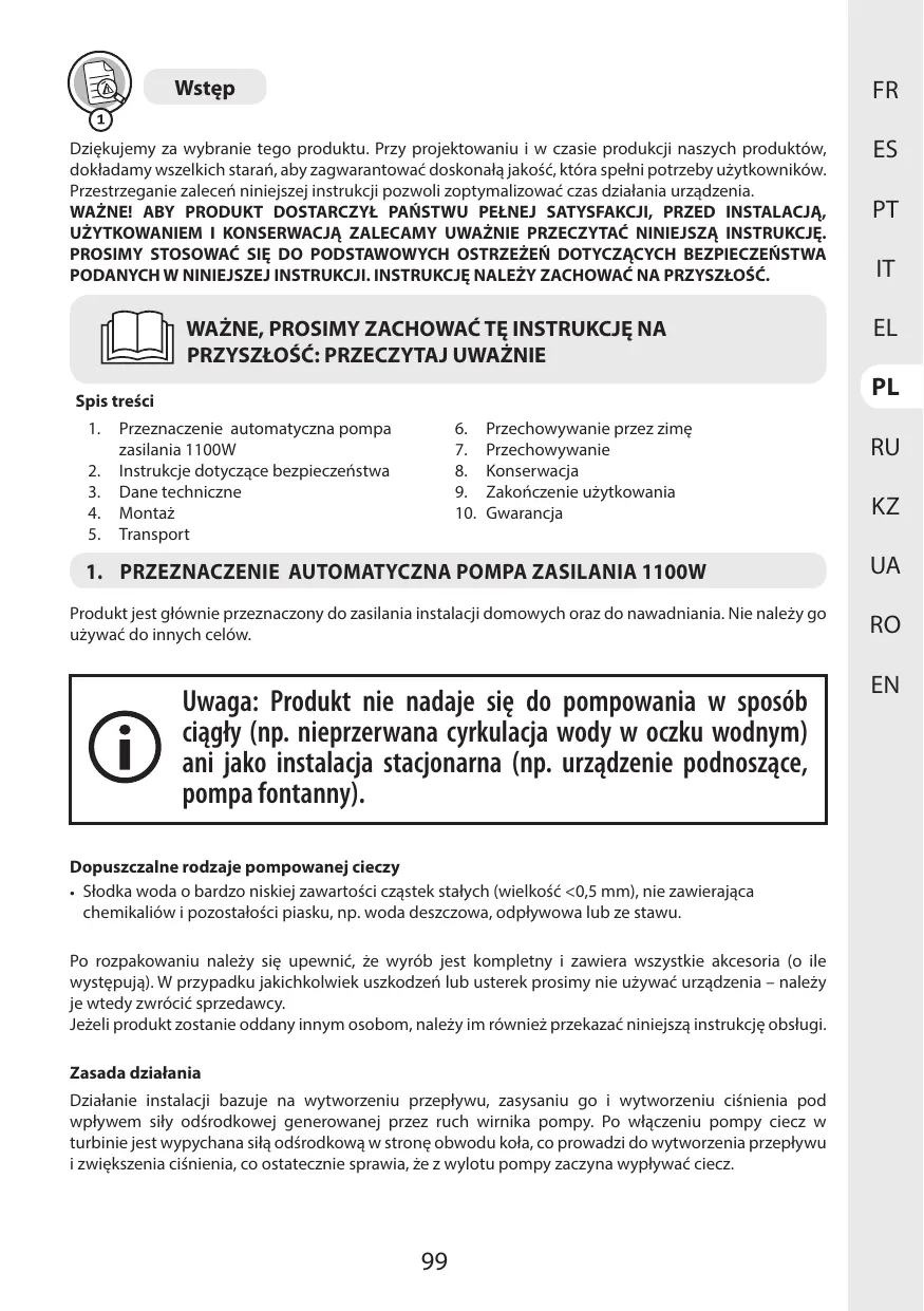FR ES EN NIEBEZPIECZENSTWO: Ryzyko urazôw, ryzyko uszkodzenia! Pompy nie wolno uzywaé do transportu cieczy Zracych, fatwopalnych (nawet nieznacznie) oraz innych substancji wybuchowych (takich jak benzyna, ropa, rozpuszczony azot), smarôw, olejéw, stonej wody i $ciekéw z toalet, a takze wody zamulonej o mniejszej predkosci przeptywu niz zwykla woda. Temperatura pormpowane] deczy musi sie miescié w przedziale od 5°C do 35°C.