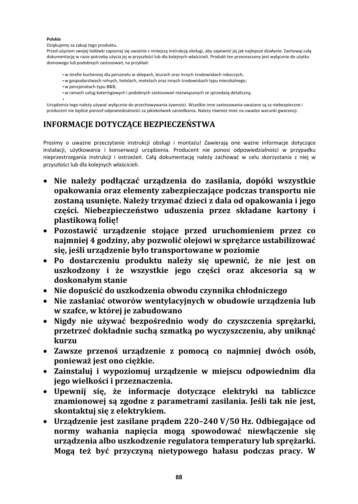 Cet appareil doit être utilisé uniquement pour conserver de la nourriture ; tout autre usage est considéré comme dangereux et le fabricant ne sera pas tenu responsable en cas de mauvaise utilisation. Il est donc recommandé de prendre connaissance des conditions de garantie.