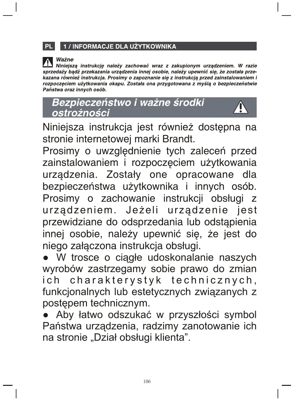 Bezpieczenñstwo i wazne $rodki À ostroznosci Niniejsza instrukcja jest réwniez dostepna na stronie internetowej marki Brandt. Prosimy o uwzglednienie tych zaleceñ przed zainstalowaniem i rozpoczeciem uzytkowania urzadzenia. Zostaty one opracowane dla bezpieczeñstwa uzytkownika i innych os6b. Prosimy o zachowanie instrukcji obstugi z urzadzeniem. Jezeli urzadzenie jest przewidziane do odsprzedania lub odstapienia innej osobie, naleZy upewnié sie, Ze jest do niego zataczona instrukcja obstugi. e W trosce o ciagte udoskonalanie naszych wyrobôw zastrzegamy sobie prawo do zmian ich charakterystyk technicznych, funkcjonalnych lub estetycznych zwigzanych z postepem technicznym. e Aby tatwo odszukaé w przyszto$ci symbol Pañstwa urzadzenia, radzimy zanotowanie ich na stronie ,Dziat obstugi klienta”.