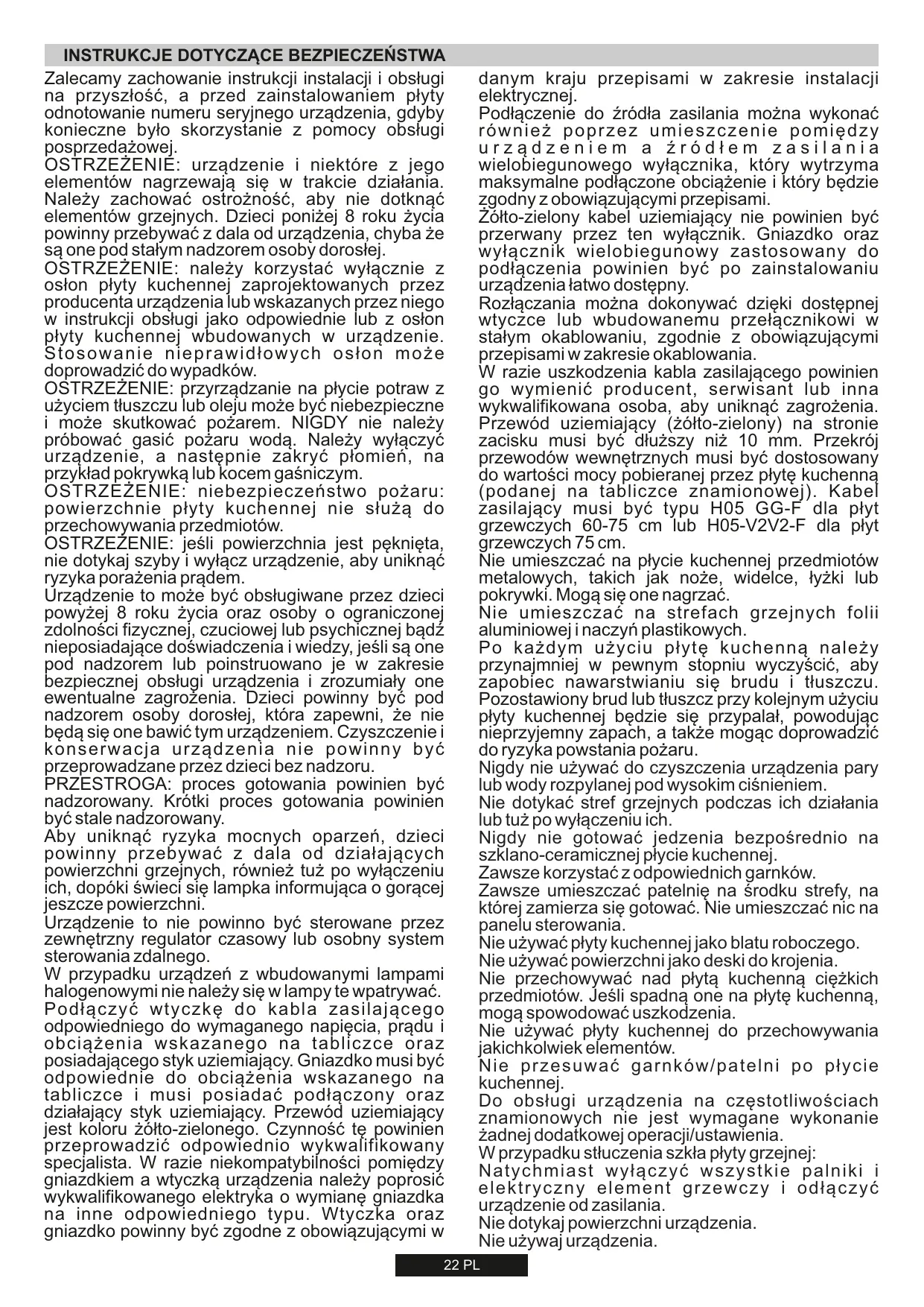AVERTISSEMENT : l'appareil et ses parties accessibles chauffent pendant l'utilisation. Evitez de toucher les éléments chauffants. Les enfants de moins de 8 ans doivent être tenus hors de portée de l'appareil, sauf s'ils sont surveillés en permanence. AVERTISSEMENT : n'utilisez qu'un dispositif de rotection de votre table de cuisson conçu par le abricant de votre appareil ou indiqué, dans le manuel d'utilisation, comme étant compatible, ou bien le dispositif de protection fourni avec l'appareil. L'utilisation d'un dispositif de protection non approprié peut causer des accidents. AVERTISSEMENT : l'utilisation de la table de cuisson sans surveillance avec manipulation de graisse ou d'huile peut être dangereux et provoquer un incendie. N'essayez JAMAÏS d'éteindre un feu avec de l'eau, mais éteignez l'appareil, puis couvrez la flamme avec un couvercle où une couverture anti-feu, par exemple. AVERTISSEMENT, risque d'incendie : ne stockez pas d'éléments sur les surfaces de cuisson. AVERTISSEMENT : si la surface est fissurée, ne touchez pas le verre de la table et éteignez l'appareil pour éviter tout risque d'électrocution. Cet appareil peut être utilisé par des enfants âgés de 8 ans et plus, par des personnes dont les capacités physiques, sensorielles ou mentales sont réduites où par des personnes dénuées d'expérience et de connaissances, mais qui ont été informées sur la manière d'utiliser l'appareil en toute sécurité, si elles comprennent les risques impliqués. Surveillez les enfants afin qu'ils ne jouent pas avec l'appareil. L'entretien et le nettoyage ne doivent pas être effectués par des enfants Sans surveillance. ATTENTION : la cuisson demande d'être surveillée. Les cuissons de courte durée doivent être surveillées en permanence. Il est chaudement recommandé d'éloigner les enfants de la zone de cuisson lorsqu'elle fonctionne ou même quand elle est éteinte, mais que l'indicateur de chaleur résiduelle est encore visible, afin d'éviter tout risque de brûlures graves. Cet appareil n'est pas conçu pour être actionné par un temporisateur externe ou un système séparé de commande à distance. Si votre table de cuisson est dotée d'éléments halogènes, n'en fixez pas la lumière. Brancher le câble d'alimentation sur une prise de courant qui supporte le voltage (le courant et la charge sont indiqués sur l'étiquette) et vérifier la présence d'une mise à la terre. La prise d'alimentation doit supporter la charge indiquée sur l'étiquette et être dotée d'une mise à la terre en état de fonctionnement. Le câble conducteur de mise à la terre est jaune et vert. Cette opération doit être exécutée par du personnel qualifié. En cas d'incompatibilité entre la prise d'alimentation et la fiche du câble de l'appareil. demander à un électricien professionnel de remplacer la prise d'alimentation par un dispositif compatible. La fiche du câble d'alimentation et la prise d'alimentation doivent être conformes aux normes en vigueur dans le pays d'installation. Il est possible de brancher l'appareil à la prise