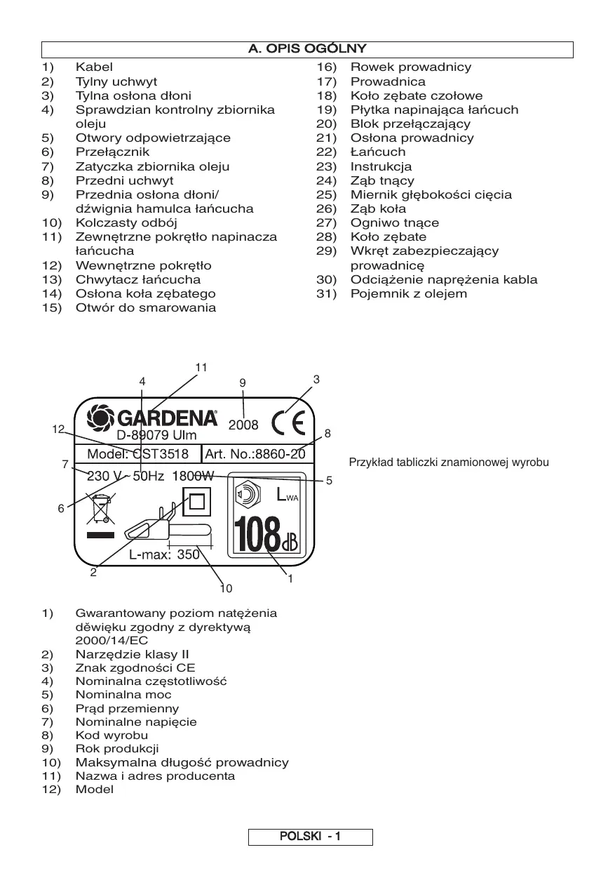 Opis urzadzenia. Chainsaw - Pila tañcuchowa TyP. CST3018, CST3518 - CS = Chainsaw Rok oznaczenia CE. 2009
