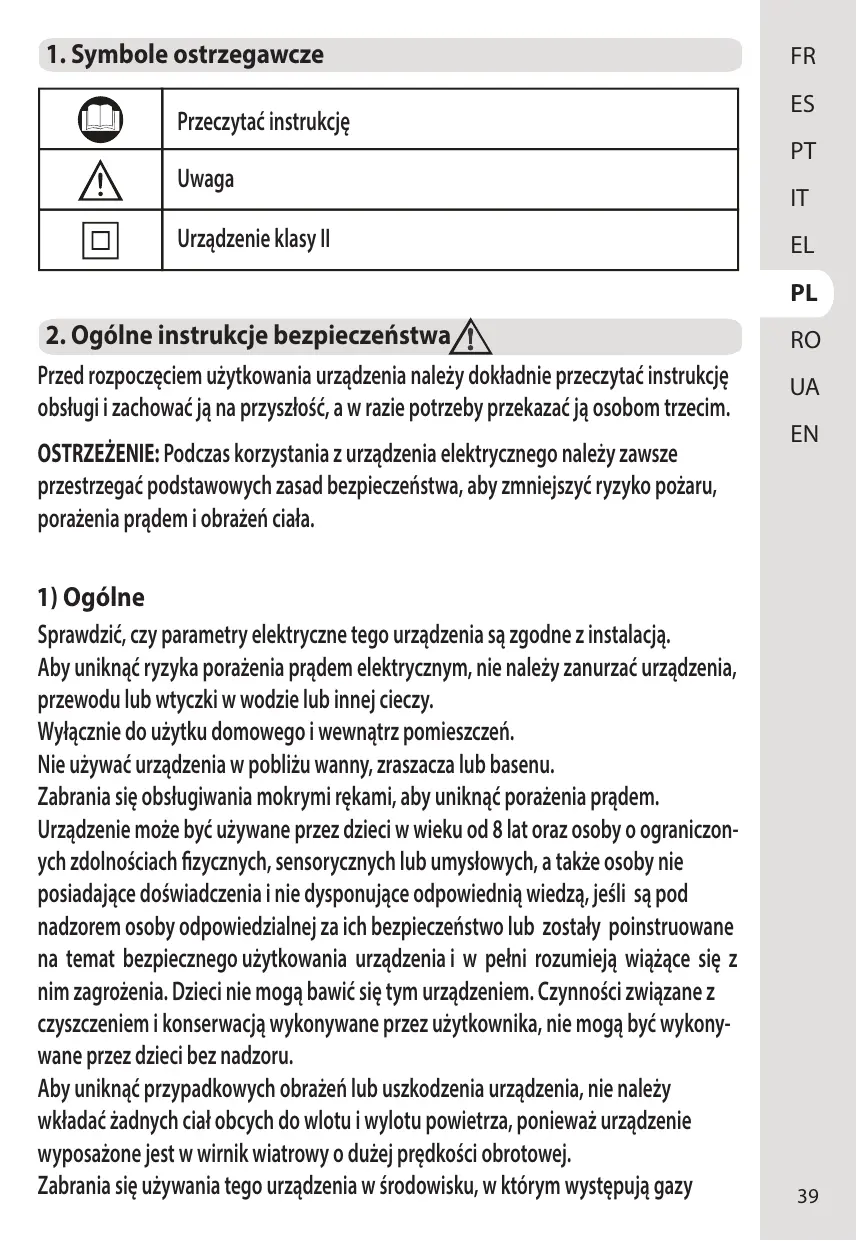 Pour éviter toute blessure accidentelle ou tout dommage à l'appareil, n'insérez aucun corps étranger dans l'entrée et la sortie d'air, car l'appareil est équipé d'un rotor à