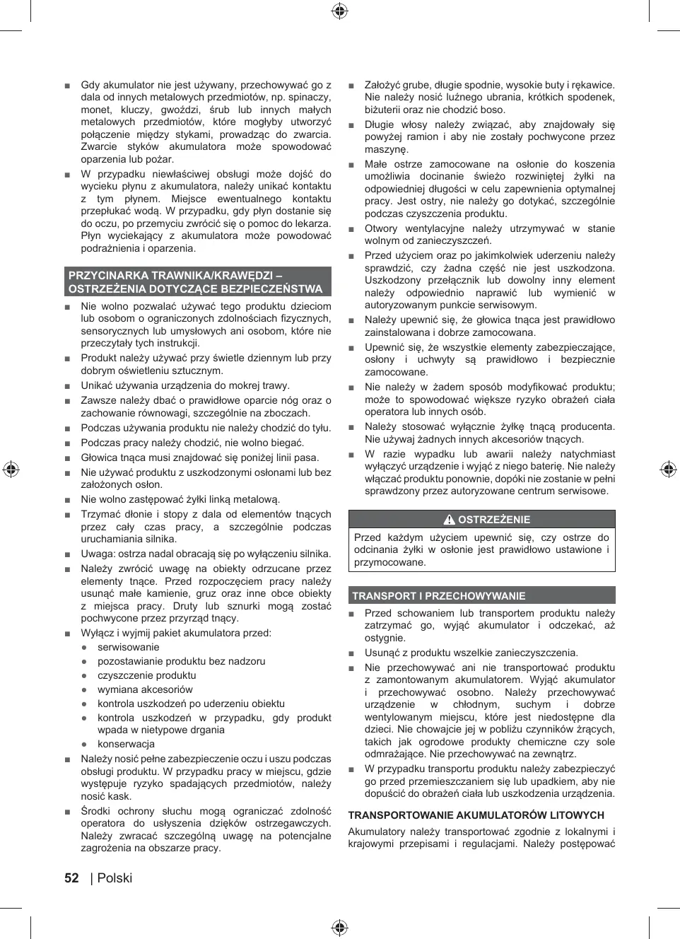 Débarrassez l'appareil de tous les corps étrangers. N'entreposez et ne transportez pas le produit équipé d'une batterie. Retirez-la et fixez-la séparément. Rangez-le dans un endroit frais, sec et correctement ventilé, hors de portée des enfants. Ne le rangez pas à proximité d'agents corrosifs tels que des produits chimiques de jardinage ou des sels de dégel. Ne le rangez pas à l'extérieur. = Pour le transport, attachez le produit pour l'empêcher de bouger ou de tomber, afin d'éviter toute blessure et tout dommage matériel.