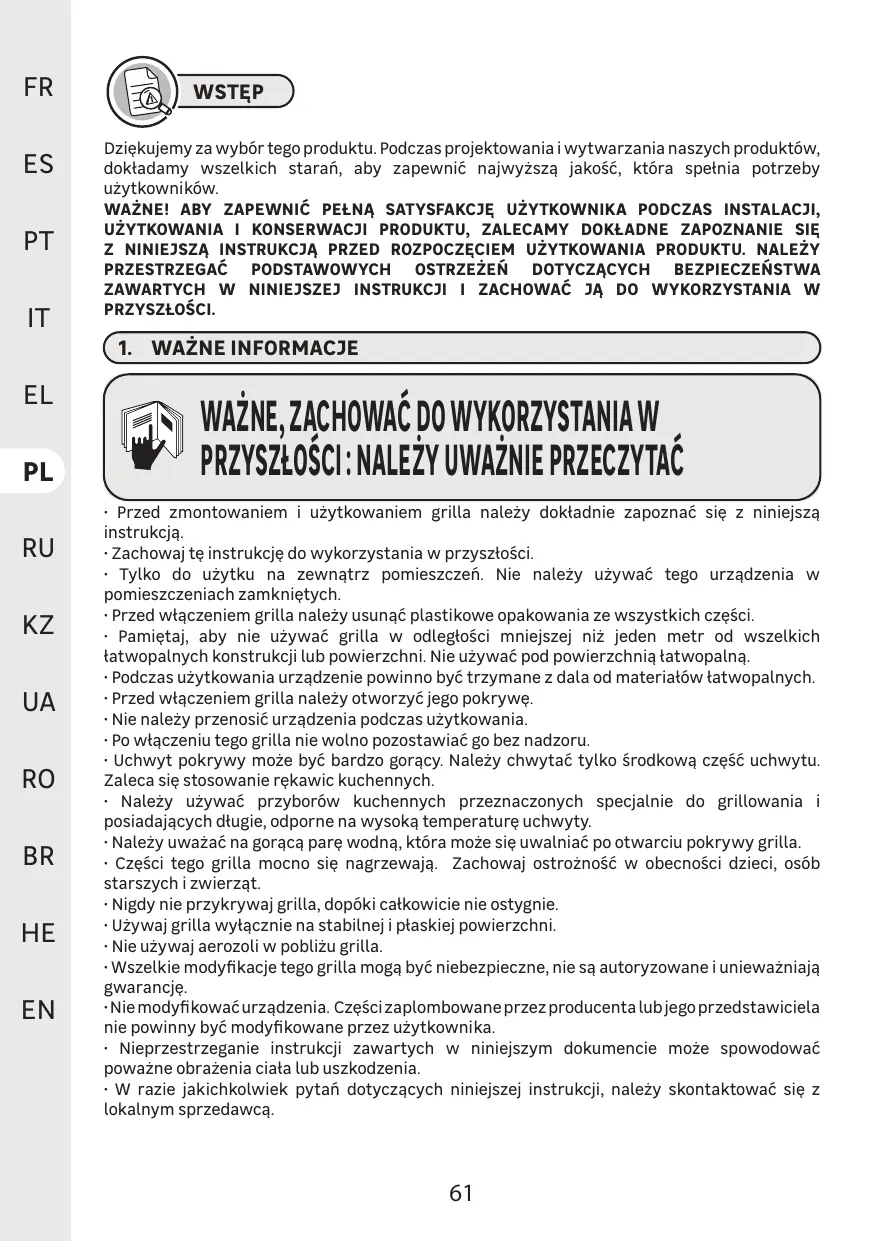 + Przed zmontowaniem i uzytkowaniem grilla nalezy doktadnie zapoznaé sie z niniejsza instrukcja.