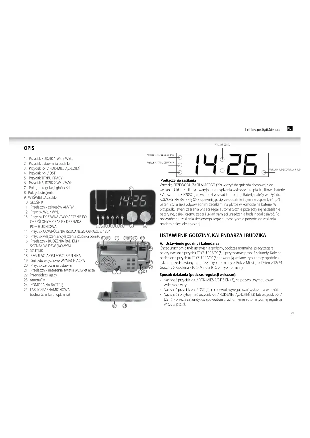 (dolna ścianka urządzenia) Podłączenie zasilania Wtyczkę PRZEWODU ZASILAJĄCEGO (22) włożyć do gniazda domowej sieci zasilania. Układ zasilania awaryjnego urządzenia wykorzystuje płaską, litową baterię 3V o symbolu CR2032 (nie wchodzi w skład kompletu). Baterię należy włożyć do KOMORY NA BATERIĘ (24), upewniając się, że dodatnie i ujemne złącze („+” i „-”) baterii styka się z odpowiednimi zaciskami na płytce w komorze na baterię. W przypadku awarii zasilania w sieci zegar automatycznie przełączy się na zasilanie bateryjne, dzięki czemu zegar i układ pamięci urządzenia będą nadal działać. Po przywróceniu zasilania sieciowego zegar automatycznie powróci do zasilania prądem z sieci elektrycznej.