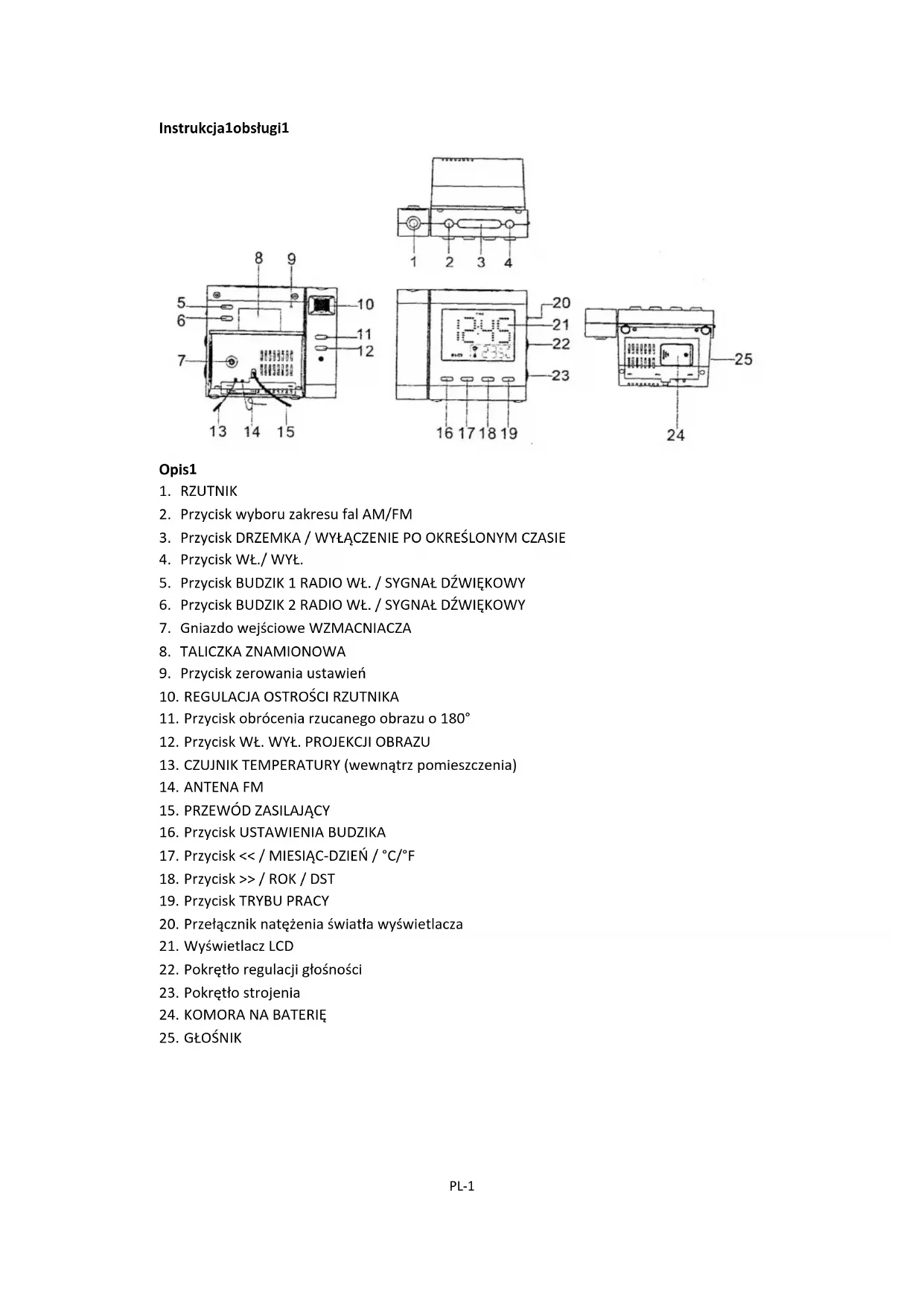 Podłączenie zasilania Wtyczkę PRZEWODU ZASILAJĄCEGO (15) włożyć do gniazda domowej sieci zasilania. Układ zasilania awaryjnego urządzenia wykorzystuje płaską, litową baterię 3V o symbolu CR2032 (nie wchodzi w skład kompletu). Baterię należy włożyć do KOMORY NA BATERIĘ (24), upewniając się, że dodatnie i ujemne złącze („+” i „-”) baterii styka się z odpowiednimi zaciskami na płytce w komorze na baterię. W przypadku awarii zasilania w sieci zegar automatycznie przełączy się na zasilanie bateryjne, dzięki czemu zegar i układ pamięci urządzenia będą nadal działać. Po przywróceniu zasilania sieciowego zegar automatycznie powróci do zasilania prądem z sieci elektrycznej. Ustawienie godziny, kalendarza i budzika A. Ustawienie godziny i kalendarza Chcąc uruchomić tryb ustawiania godziny, podczas normalnej pracy zegara należy nacisnąć przycisk TRYBU PRACY (19) i przytrzymać przez 2 sekundy. Kolejne naciśnięcia przycisku TRYBU PRACY (19) powodują zmianę trybu pracy zgodnie z cyklem przedstawionym poniżej: Tryb normalny Rok Miesiąc Dzień 12/24 Godziny Godzina RTC Minuta RTC Tryb normalny Sposób działania (podczas regulacji wskazań): - Nacisnąć przycisk << / MIESIĄC-DZIEŃ / °C/°F (17), co pozwoli wyregulować wskazania w tył. - Nacisnąć przycisk >> / ROK / DST (18), co pozwoli wyregulować wskazania w przód. - Nacisnąć i przytrzymać przycisk << / MIESIĄC-DZIEŃ / °C/°F (17) lub przycisk >> / ROK / DST (18) przez 2 sekundy, co spowoduje uruchomienie automatycznej regulacji w tył/w przód. B. Ustawienie budzika 1 i budzika 2 Podczas pracy zegara w normalnym trybie nacisnąć przycisk USTAWIENIA BUDZIKA (16) i przytrzymać go wciśniętym przez 2 sekundy. Kolejne naciśnięcia przycisku USTAWIENIA BUDZIKA (16) powodują zmianę trybu pracy zgodnie z cyklem przedstawionym poniżej: Tryb normalny AL.1 Godzina AL.1 Minuta AL.1 Dzień powszedni AL.2 Godzina AL.2 Minuta AL.2 Dzień powszedni Tryb normalny Wyboru trybu pracy budzika dokonuje się następująco: 1-5 od poniedziałku do piątku 1-7 cały tydzień 6-7 sobota i niedziela 1-1 jeden dzień w tygodniuPL-3 Sposób działania (podczas regulacji wskazań): - Nacisnąć przycisk << / MIESIĄC-DZIEŃ / °C/°F (17), co pozwoli wyregulować wskazania w tył. - Nacisnąć przycisk >> / ROK / DST (18), co pozwoli wyregulować wskazania w przód. - Nacisnąć i przytrzymać przycisk << / MIESIĄC-DZIEŃ / °C/°F (17) lub przycisk >> / ROK / DST (18) przez 2 sekundy, co spowoduje uruchomienie automatycznej regulacji w tył/w przód. Ustawienie dźwięku budzika oraz włączenie/wyłączenie budzika - Jeśli chcą Państwo zostać obudzeni przez dźwięk wybranej stacji radiowej, przełącznik BUDZIK 1 RADIO / SYGNAŁ DŹWIĘKOWY (5) / BUDZIK 2 RADIO / SYGNAŁ DŹWIĘKOWY (6) należy ustawić w położeniu muzyki , natomiast jeśli zechcą Państwo zostać obudzeni dźwiękiem sygnału dźwiękowego, przełącznik ten należy ustawić w położeniu brzęczyka . Wyłączenie budzika następuje wraz z przełączeniem tego przełącznika w położenie ALARM OFF. - Przełącznik ustawiania jasności wyświetlacza BUDZENIA RADIEM / SYGNAŁEM DŹWIĘKOWYM (20) ustawić w położeniu AUTOMATYCZNE (wyświetlacz automatycznie zgaśnie po 15 sekundach). W chwili uruchomienia budzika wyświetlacz automatycznie włączy się ponownie. Czas włączenia budzika i funkcja drzemki A. Czas włączenia budzika Budzik, czy to przy ustawieniu na sygnał dźwiękowy czy na radioodbiornik, wyłączy się po 30 minutach od chwili włączenia, chyba że w tym czasie naciśnie się dowolny przycisk. Ponowne włączenie budzika nastąpi kolejnego dnia o tej samej porze. B. Funkcja drzemki - Podczas działania budzika naciśnięcie przycisku DRZEMKA / WYŁĄCZENIE PO OKREŚLONYM CZASIE (3) spowoduje uruchomienie funkcji drzemki i wyłączenie dźwięku budzika. - Okres wyłączenia budzika w tym trybie pracy wynosi 9 minut. - Funkcja drzemki działać będzie do chwili naciśnięcia przycisku WŁ./WYŁ. (4) i wyłączenia budzika. Budzik automatycznie wyłączy się po 30 minutach. - Przełącznik ustawiania jasności wyświetlacza (20) ustawić w położeniu WYŁĄCZENIE AUTOMATYCZNE (wyświetlacz automatycznie zgaśnie po 15 sekundach). W chwili uruchomienia budzika wyświetlacz automatycznie włączy się ponownie. Naciśnięcie przycisku DRZEMKA / WYŁĄCZENIE PO OKREŚLONYM CZASIE (3) spowoduje włączenie funkcji drzemki, co wyłączy dźwięk budzika i spowoduje zgaśnięcie wyświetlacza. Zmiana informacji wyświetlanych na wyświetlaczu Nacisnąć przycisk << / MIESIĄC-DZIEŃ / °C/°F (17), co spowoduje wyświetlenie informacji na temat aktualnej daty w formacie Miesiąc/Dzień. Po 5 sekundach wyświetlacz samoczynnie powróci do wyświetlania aktualnej godziny. Nacisnąć przycisk >> / ROK / DST (18), co spowoduje wyświetlenie informacji na temat aktualnego roku. Po 5 sekundach wyświetlacz samoczynnie powróci do wyświetlania aktualnej godziny.PL-4 Funkcja wyłączenia radioodbiornika po określonym czasie Gdy radioodbiornik jest włączony, nacisnąć przycisk DRZEMKA / WYŁĄCZENIE PO OKREŚLONYM CZASIE (3), co spowoduje włączenie funkcji wyłączenia radioodbiornika po określonym czasie. Przez 5 sekund na wyświetlaczu błyskać będą cyfry, a w tym czasie należy ponownie nacisnąć przycisk DRZEMKA / WYŁĄCZENIE PO OKREŚLONYM CZASIE (3) i ustawić czas, po którym nastąpi wyłączenie, w zakresie od 90 do 15 minut. Wyłączenie tej funkcji nastąpi z chwilą naciśnięcia przycisku WŁ./WYŁ. (4). Wyłączenie podświetlenia wyświetlacza W chwili, gdy radioodbiornik jest wyłączony, regulator natężenia podświetlenia wyświetlacza LCD (20) ustawić w położeniu WYŁĄCZ AUTOMATYCZNE, co spowoduje zgaśnięcie wyświetlacza LCD po 15 sekundach. - Naciśnięcie dowolnego przycisku spowoduje ponowne włączenie wyświetlacza. DST - Czas letni i czas zimowy Zmiany czasu z let