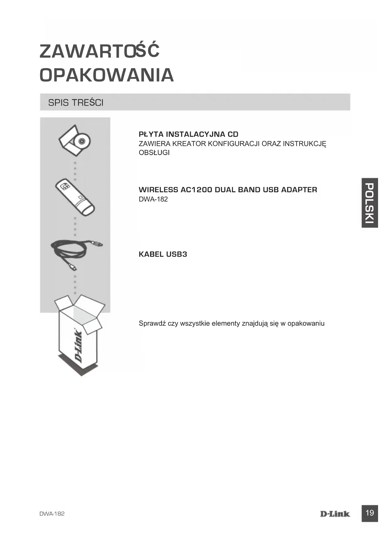 YTA INSTALACYJNA CD ZAWIERA KREATOR KONFIGURACJI ORAZ INSTRUKCJĘ OBSŁUGIWIRELESS AC1200 DUAL BAND USB ADAPTERDWA-182Sprawdź czy wszystkie elementy znajdują się w opakowaniuKABEL USB3DWA-182