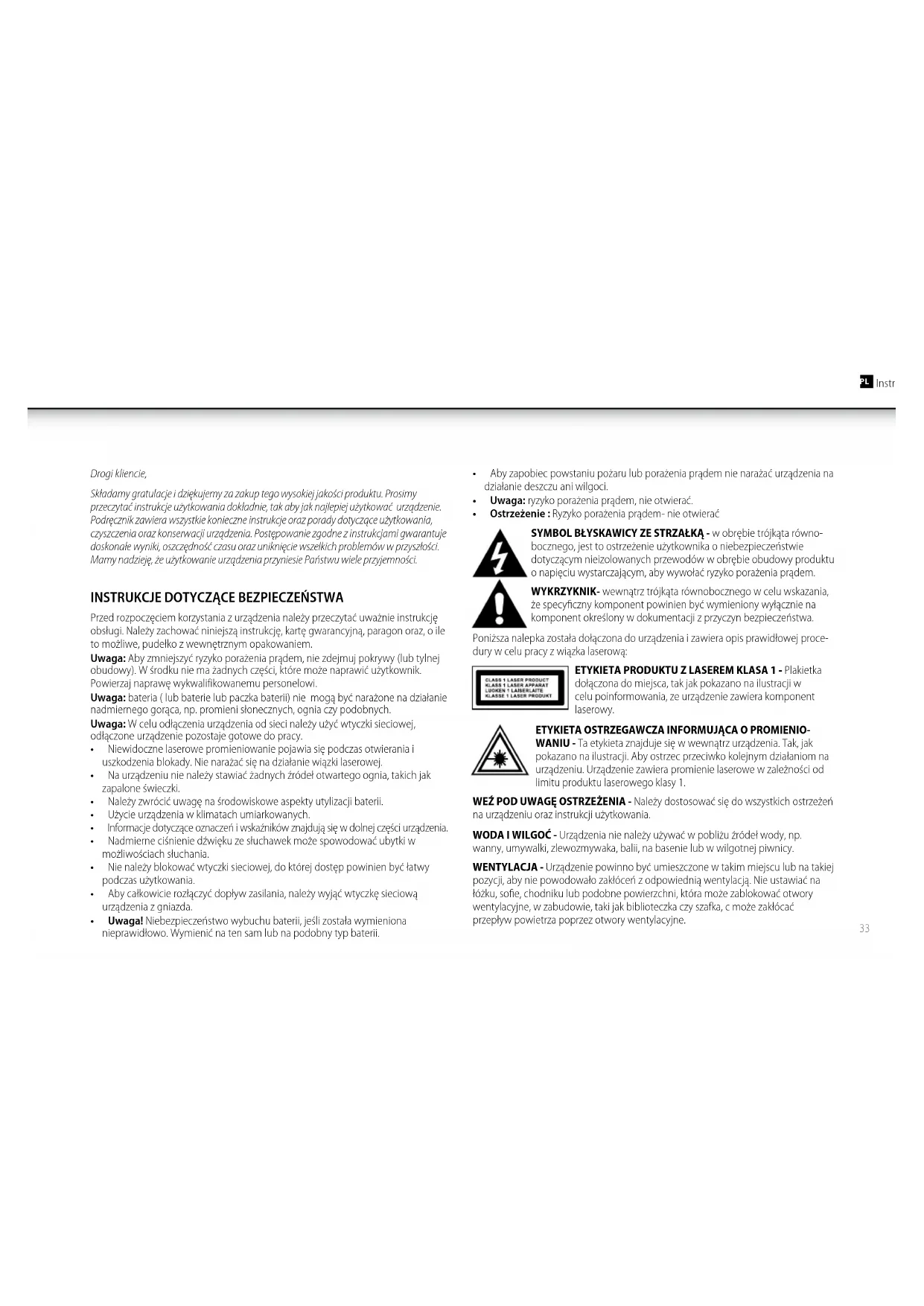 WANIU - Ta etykieta znajduje się w wewnątrz urządzenia. Tak, jak pokazano na ilustracji. Aby ostrzec przeciwko kolejnym działaniom na urządzeniu. Urządzenie zawiera promienie laserowe w zależności od limitu produktu laserowego klasy 1. WEŹ POD UWAGĘ OSTRZEŻENIA - Należy dostosować się do wszystkich ostrzeżeń na urządzeniu oraz instrukcji użytkowania. WODA I WILGOĆ - Urządzenia nie należy używać w pobliżu źródeł wody, np. wanny, umywalki, zlewozmywaka, balii, na basenie lub w wilgotnej piwnicy. WENTYLACJA - Urządzenie powinno być umieszczone w takim miejscu lub na takiej pozycji, aby nie powodowało zakłóceń z odpowiednią wentylacją. Nie ustawiać na łóżku, sofie, chodniku lub podobne powierzchni, która może zablokować otwory wentylacyjne, w zabudowie, taki jak biblioteczka czy szafka, c może zakłócać przepływ powietrza poprzez otwory wentylacyjne.