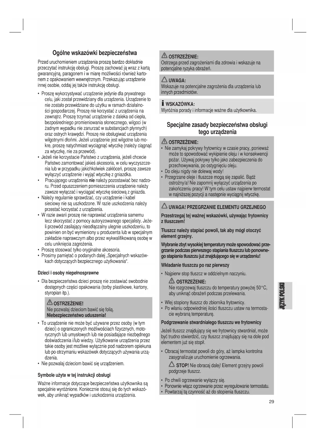 • Prosimy pamiętać o podanych dalej „Specjalnych wskazów-