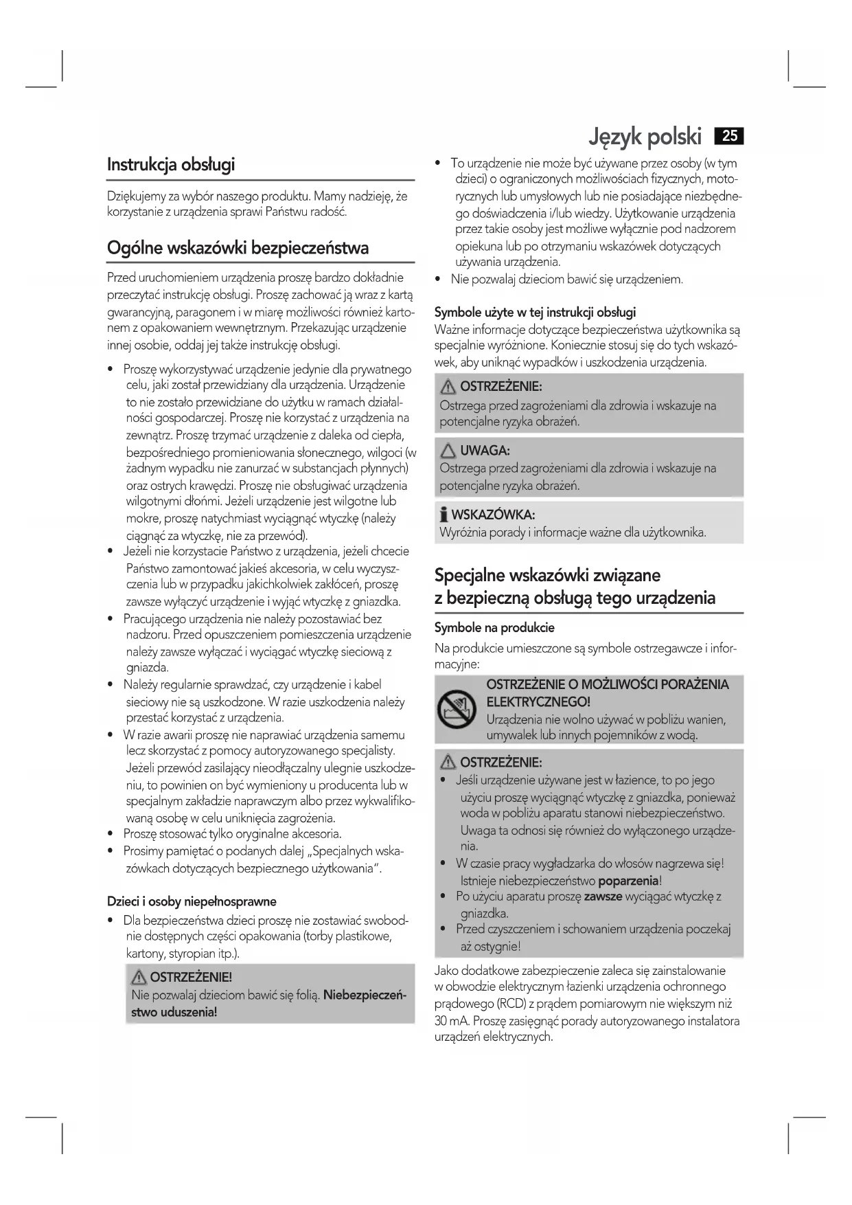 - Niepozwalajdzieciombawićsięurządzeniem. Symbole użyte w tej instrukcji obsługi Ważne informacje dotyczące bezpieczeństwa użytkownika są specjalnie wyróżnione. Koniecznie stosuj się do tych wskazó- wek, aby uniknąć wypadków i uszkodzenia urządzenia. OSTRZEŻENIE: Ostrzega przed zagrożeniami dla zdrowia i wskazuje na potencjalne ryzyka obrażeń. UWAGA: Ostrzega przed zagrożeniami dla zdrowia i wskazuje na potencjalne ryzyka obrażeń. WSKAZÓWKA: Wyróżnia porady i informacje ważne dla użytkownika. Specjalne wskazówki związane z bezpieczną obsługą tego urządzenia Symbole na produkcie Na produkcie umieszczone są symbole ostrzegawcze i infor- macyjne: OSTRZEŻENIE O MOŻLIWOŚCI PORAŻENIA ELEKTRYCZNEGO! Urządzenia nie wolno używać w pobliżu wanien, umywalek lub innych pojemników z wodą. OSTRZEŻENIE: