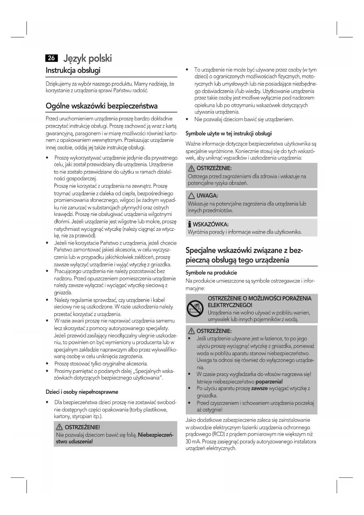 - Niepozwalajdzieciombawićsięurządzeniem. Symbole użyte w tej instrukcji obsługi Ważne informacje dotyczące bezpieczeństwa użytkownika są specjalnie wyróżnione. Koniecznie stosuj się do tych wskazó- wek, aby uniknąć wypadków i uszkodzenia urządzenia: OSTRZEŻENIE: Ostrzega przed zagrożeniami dla zdrowia i wskazuje na potencjalne ryzyka obrażeń. UWAGA: Wskazuje na potencjalne zagrożenia dla urządzenia lub innych przedmiotów. WSKAZÓWKA: Wyróżnia porady i informacje ważne dla użytkownika. Specjalne wskazówki związane z bez- pieczną obsługą tego urządzenia Symbole na produkcie Na produkcie umieszczone są symbole ostrzegawcze i infor- macyjne: OSTRZEŻENIE O MOŻLIWOŚCI PORAŻENIA ELEKTRYCZNEGO! Urządzenia nie wolno używać w pobliżu wanien, umywalek lub innych pojemników z wodą. OSTRZEŻENIE: