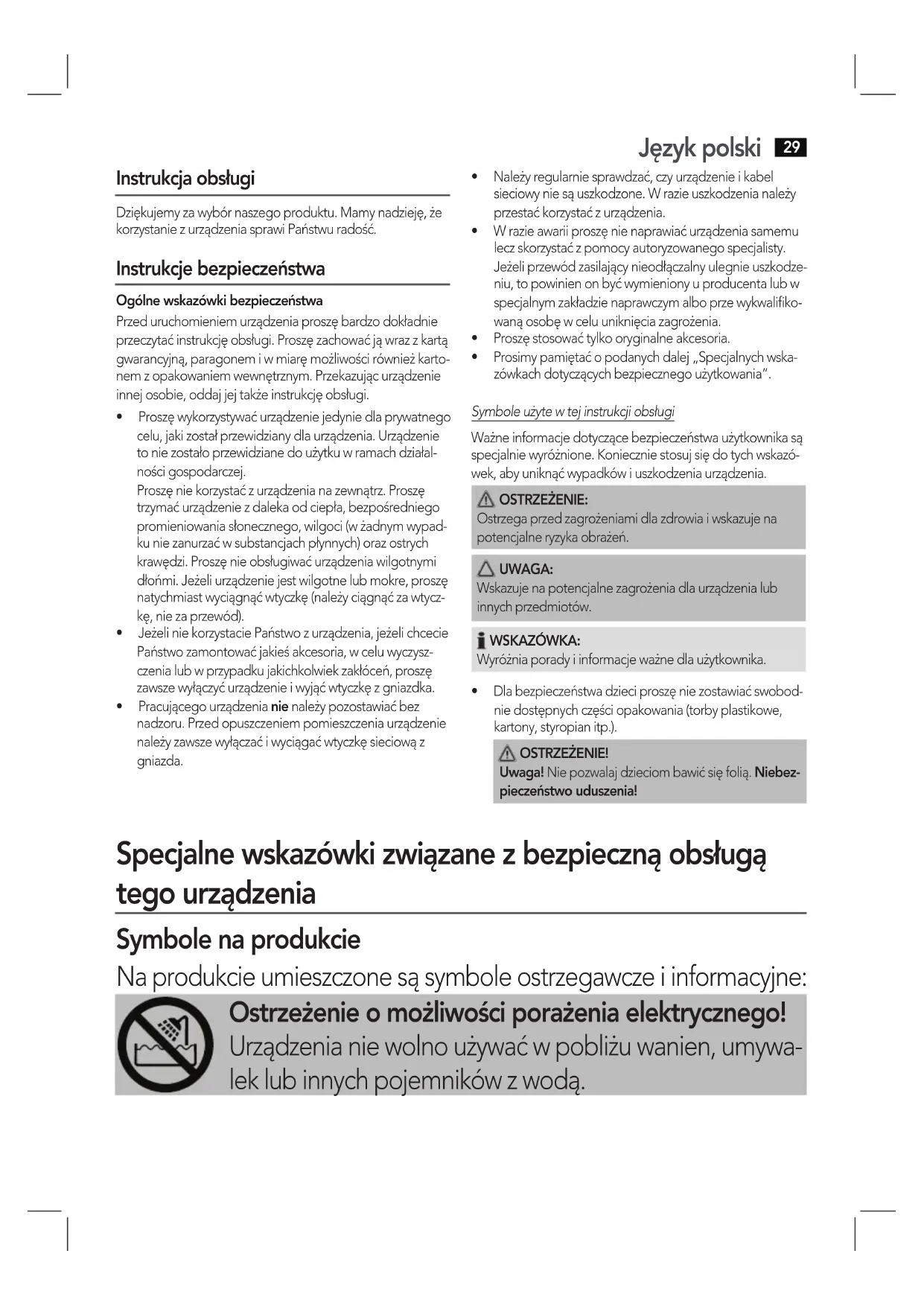 - W razie awarii prosze nie naprawiać urzadzenia samemu lecz skorzystać z pomocy autoryzowanego SPECIALYST. Jeźeli przywośd zasilajczy niedlączalny ulegnie uzzkodzenia, to powinien on byc wymiemeny u producenta lub w specialnym zakladzie naprawczym albo przy wykwalifikowana osobę weluunikcie zagrożenia.