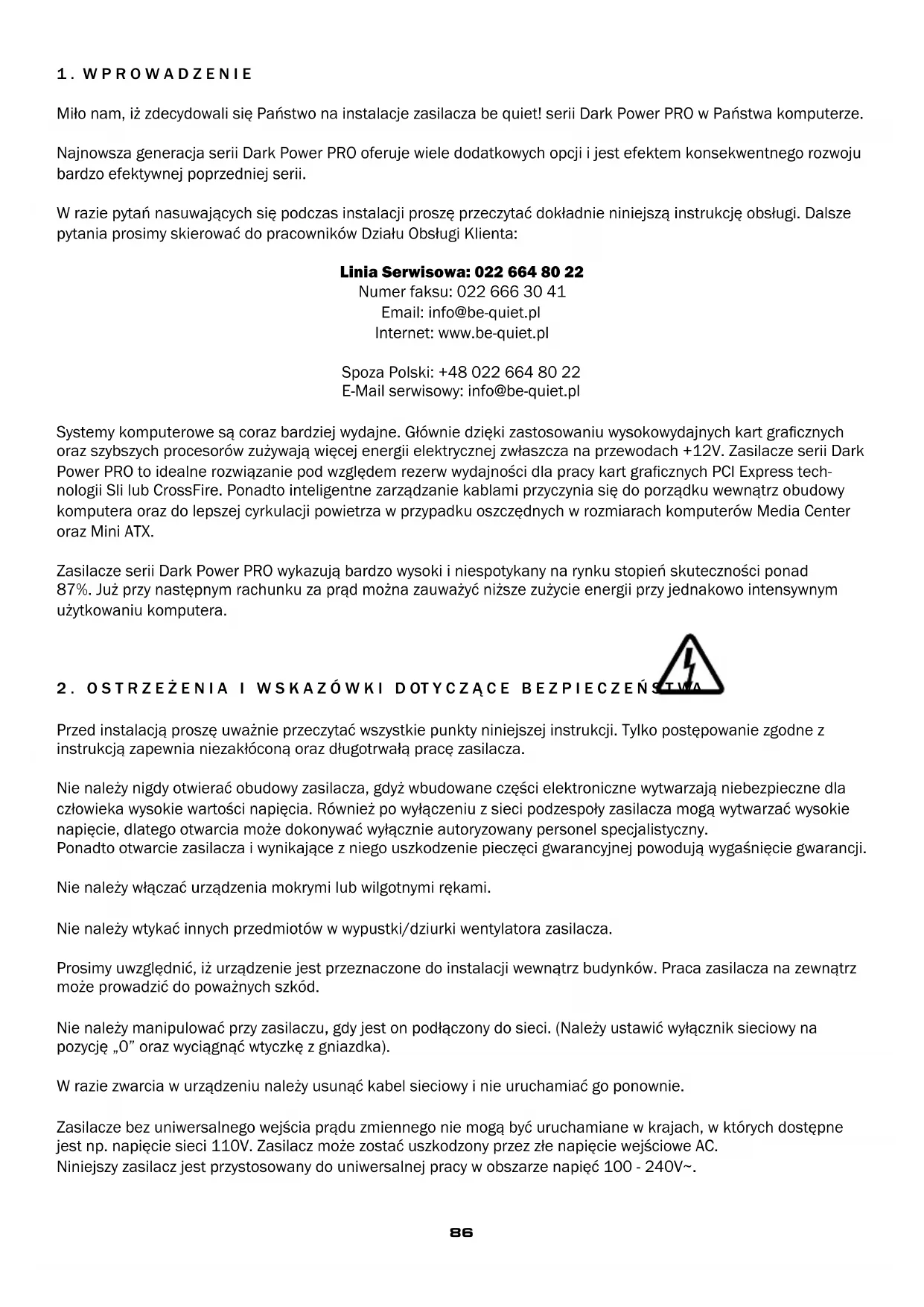 Posiadacze zasilacza be quiet! moga zadawac pytania dotyczace zasilaczy na numer linii serwisowej. Prosze dzwonić w godzinach od 9:30 do 17:00 w dni powszednie pod numer 022 664 80 22 z prośba o przyȩczenia do dziafu serwisu.