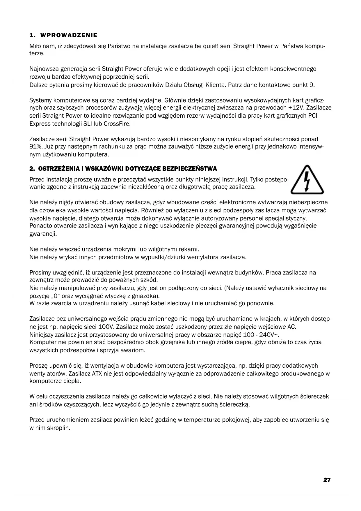Wszystkie zasilacze be quiet! wyposazone są w licznne funkcie bezpieczenerswa, któ rama za zadanie chronicu uzytkownika, a také zasilacz oraz wzystkie podlaczone komponenty. Po uaktywnieniu sie dowolné go tych zabe pieczenia w Większość przypadów dochodz do ponownego startu lub wyłaczenia systemu. W tym przypadku naleź dokonać analizy moziwych będów komputera. W celu systematyczné go wyszukiwania ewentualnych będów prosze przyȩcytać rozdział „Usuwanie usterek" na nastepnych stronach. Seria Straight Power udostepania(ndopujeace funkcie bezpieczenerswa:
