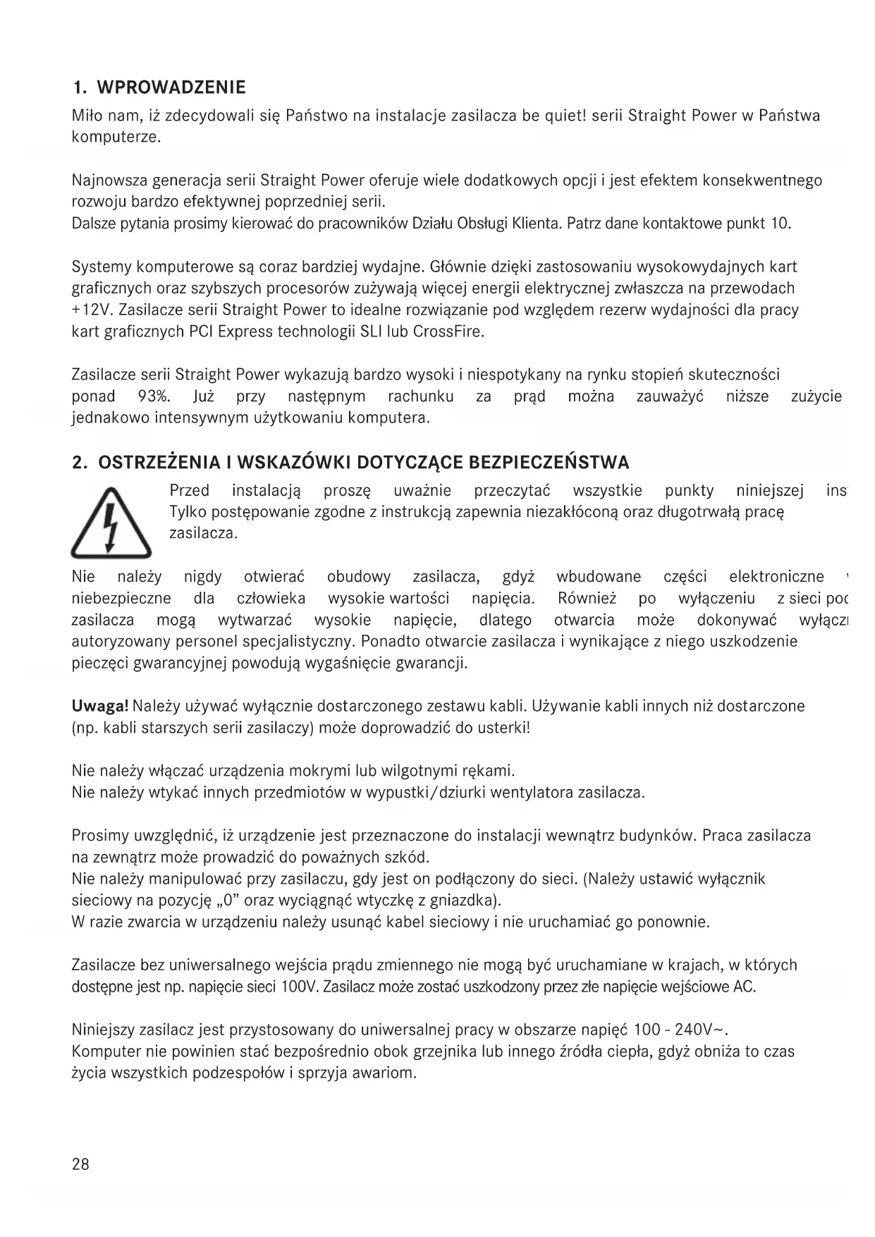 Miłonam,iżzdecydowalisięPaństwonainstalacjezasilaczabequiet!seriiStraightPowerwPaństwa komputerze. NajnowszageneracjaseriiStraightPoweroferujewieledodatkowychopcjiijestefektemkonsekwentnego rozwoju bardzo efektywnej poprzedniej serii. DalszepytaniaprosimykierowaćdopracownikówDziałuObsługiKlienta.Patrzdanekontaktowepunkt10. Systemykomputerowesącorazbardziejwydajne.Główniedziękizastosowaniuwysokowydajnychkart gracznychorazszybszychprocesorówzużywająwięcejenergiielektrycznejzwłaszczanaprzewodach +12V.ZasilaczeseriiStraightPowertoidealnerozwiązaniepodwzględemrezerwwydajnościdlapracy kartgracznychPCIExpresstechnologiiSLIlubCrossFire. ZasilaczeseriiStraightPowerwykazująbardzowysokiiniespotykanynarynkustopieńskuteczności ponad 93%. Już przy następnym rachunku za prąd można zauważyć niższe zużycie energii przy jednakowointensywnymużytkowaniukomputera.