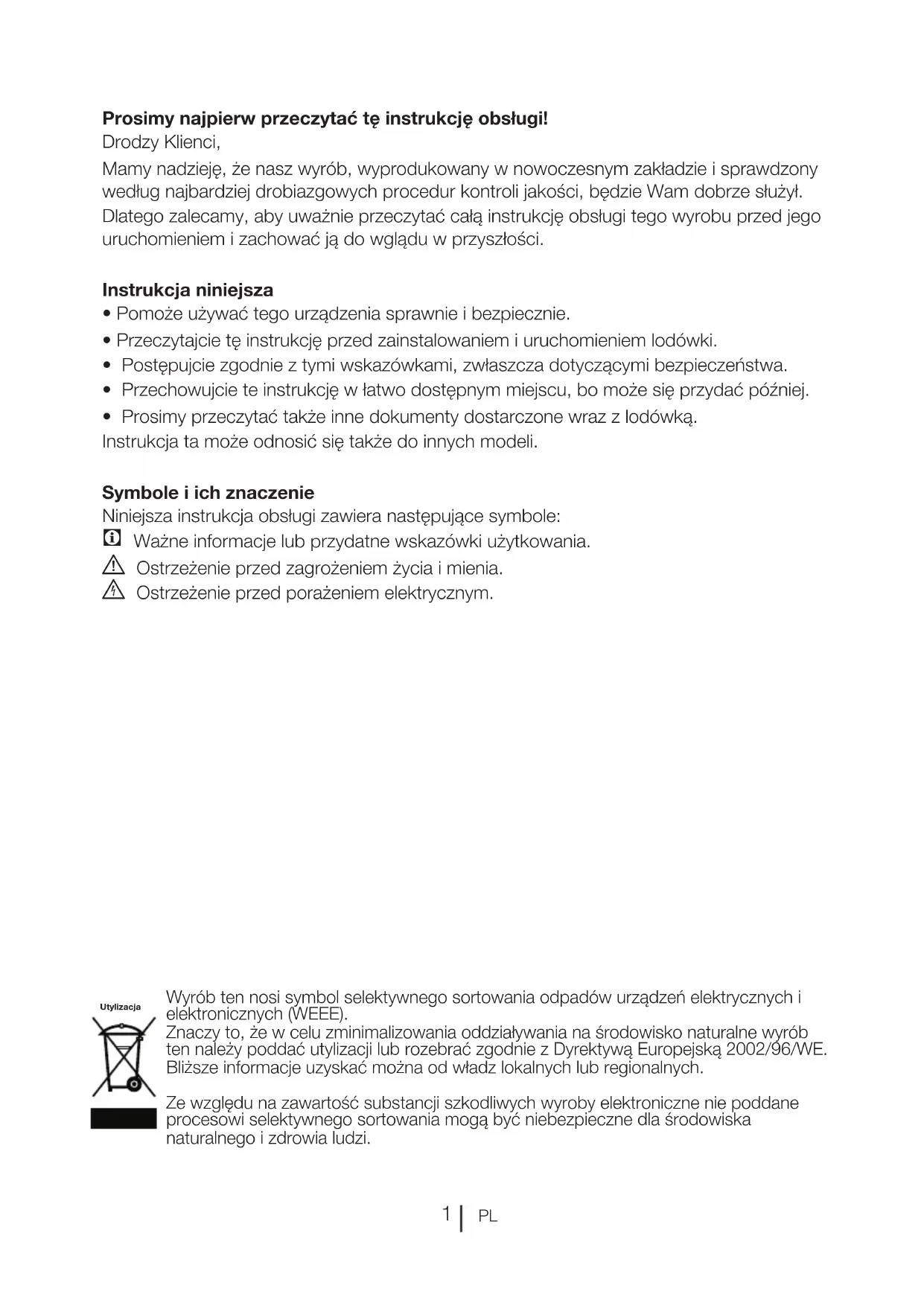 • Przeczytajcie tę instrukcję przed zainstalowaniem i uruchomieniem lodówki.