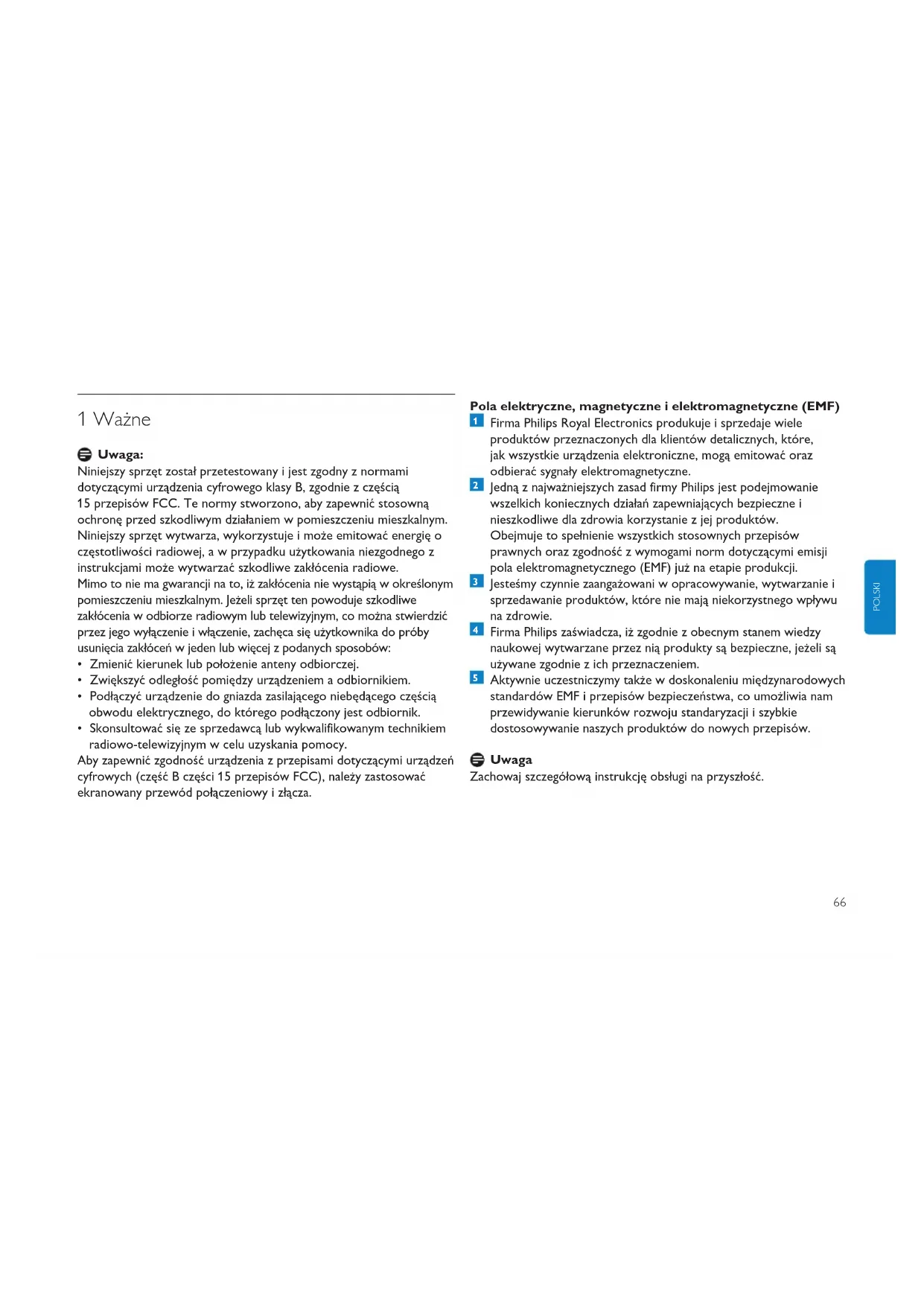 - Skonsultować się ze sprzedawcą lub wykwalifikowanym technikiem radiowo-telewizyjnym w celu uzyskania pomocy. Aby zapewnić zgodność urządzenia z przepisami dotyczącymi urządzeń cyfrowych (część B części 15 przepisów FCC), należy zastosować ekranowany przewód połączeniowy i złącza. Pola elektryczne, magnetyczne i elektromagnetyczne (EMF) Firma Philips Royal Electronics produkuje i sprzedaje wiele produktów przeznaczonych dla klientów detalicznych, które, jak wszystkie urządzenia elektroniczne, mogą emitować oraz odbierać sygnały elektromagnetyczne. Jedną z najważniejszych zasad firmy Philips jest podejmowanie wszelkich koniecznych działań zapewniających bezpieczne i nieszkodliwe dla zdrowia korzystanie z jej produktów. Obejmuje to spełnienie wszystkich stosownych przepisów prawnych oraz zgodność z wymogami norm dotyczącymi emisji pola elektromagnetycznego (EMF) już na etapie produkcji. Jesteśmy czynnie zaangażowani w opracowywanie, wytwarzanie i sprzedawanie produktów, które nie mają niekorzystnego wpływu na zdrowie. Firma Philips zaświadcza, iż zgodnie z obecnym stanem wiedzy naukowej wytwarzane przez nią produkty są bezpieczne, jeżeli są używane zgodnie z ich przeznaczeniem. Aktywnie uczestniczymy także w doskonaleniu międzynarodowych standardów EMF i przepisów bezpieczeństwa, co umożliwia nam przewidywanie kierunków rozwoju standaryzacji i szybkie dostosowywanie naszych produktów do nowych przepisów. Uwaga Zachowaj szczegółową instrukcję obsługi na przyszłość.