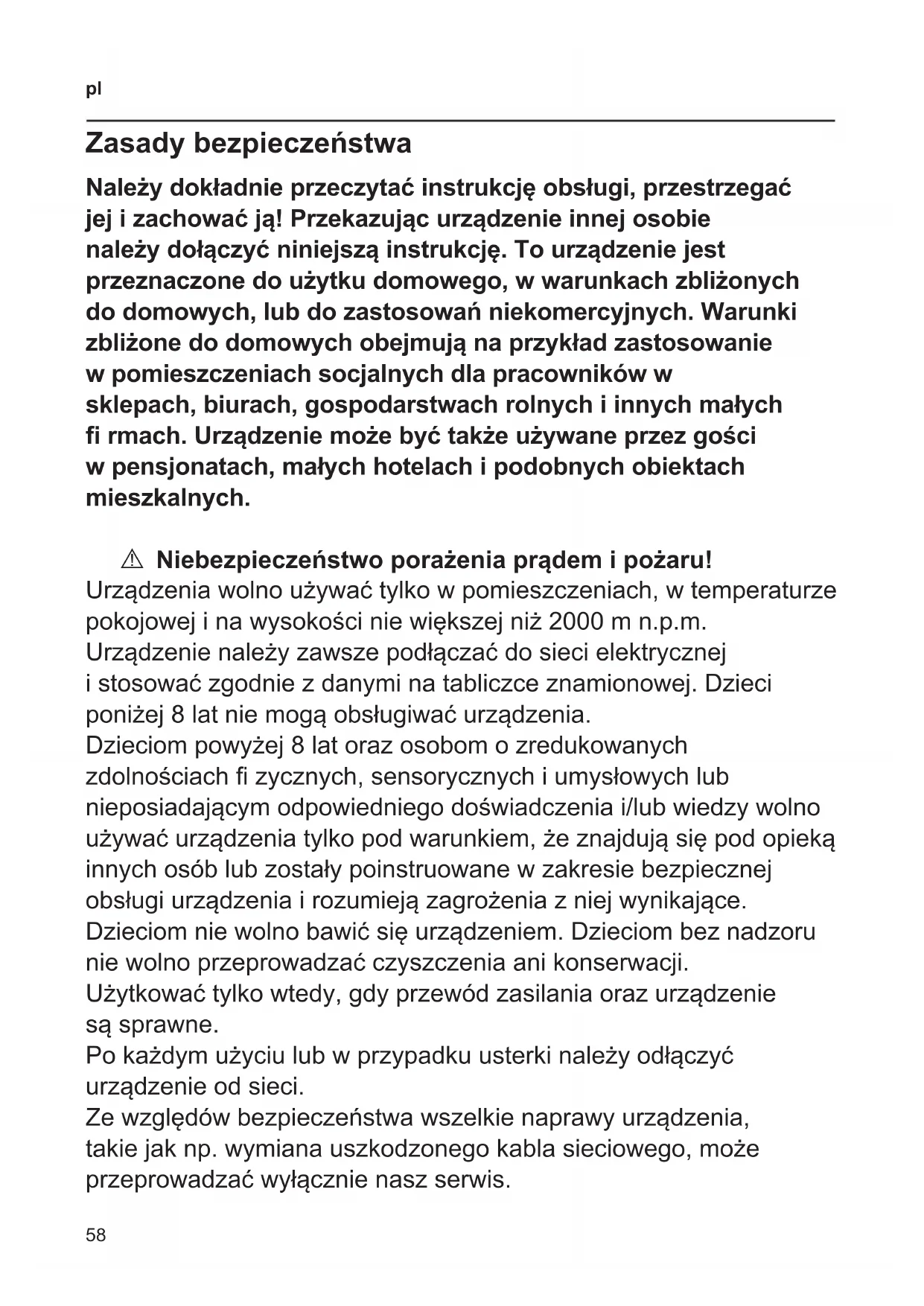 Zasady bezpieczeństwa Należy dokładnie przeczytać instrukcję obsługi, przestrzegać jej i zachować ją! Przekazując urządzenie innej osobie należy dołączyć niniejszą instrukcję. To urządzenie jest przeznaczone do użytku domowego, w warunkach zbliżonych do domowych, lub do zastosowań niekomercyjnych. Warunki zbliżone do domowych obejmują na przykład zastosowanie w pomieszczeniach socjalnych dla pracowników w sklepach, biurach, gospodarstwach rolnych i innych małych rmach. Urządzenie może być także używane przez gości w pensjonatach, małych hotelach i podobnych obiektach mieszkalnych. A Niebezpieczeństwo porażenia prądem i pożaru! Urządzenia wolno używać tylko w pomieszczeniach, w temperaturze pokojowej i na wysokości nie większej niż 2000 m n.p.m. Urządzenie należy zawsze podłączać do sieci elektrycznej i stosować zgodnie z danymi na tabliczce znamionowej. Dzieci poniżej 8 lat nie mogą obsługiwać urządzenia. Dzieciom powyżej 8 lat oraz osobom o zredukowanych zdolnościach zycznych, sensorycznych i umysłowych lub nieposiadającym odpowiedniego doświadczenia i/lub wiedzy wolno używać urządzenia tylko pod warunkiem, że znajdują się pod opieką innych osób lub zostały poinstruowane w zakresie bezpiecznej obsługi urządzenia i rozumieją zagrożenia z niej wynikające. Dzieciom nie wolno bawić się urządzeniem. Dzieciom bez nadzoru nie wolno przeprowadzać czyszczenia ani konserwacji. Użytkować tylko wtedy, gdy przewód zasilania oraz urządzenie są sprawne. Po każdym użyciu lub w przypadku usterki należy odłączyć urządzenie od sieci. Ze względów bezpieczeństwa wszelkie naprawy urządzenia, takie jak np. wymiana uszkodzonego kabla sieciowego, może przeprowadzać wyłącznie nasz serwis.59