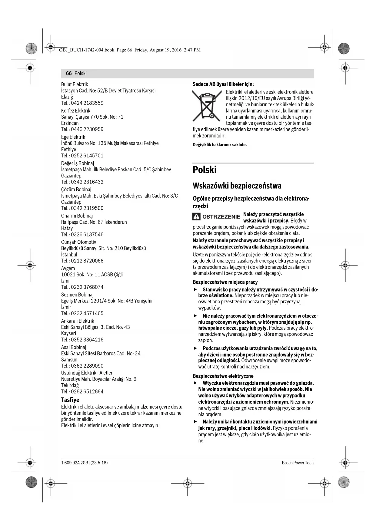 Denizli Tel.: 0258 2620666 Kullanım Ayar düğme- si pozisyonu Sıvaların ve hafif yapı malzemelerinin işlen- mesi Fayansların sökülmesi Tuğlaların işlenmesi Betonun işlenmesi OBJ_BUCH-1742-004.book Page 65 Friday, August 19, 2016 2:47 PM66 | Polski 1 609 92A 2GB | (23.5.18) Bosch Power Tools Bulut Elektrik İstasyon Cad. No: 52/B Devlet Tiyatrosu Karşısı Elazığ Tel.: 0424 2183559 Körfez Elektrik Sanayi Çarşısı 770 Sok. No: 71 Erzincan Tel.: 0446 2230959 Ege Elektrik İnönü Bulvaro No: 135 Muğla Makasarası Fethiye Fethiye Tel.: 0252 6145701 Değer İş Bobinaj İsmetpaşa Mah. İlk Belediye Başkan Cad. 5/C Şahinbey Gaziantep Tel.: 0342 2316432 Çözüm Bobinaj İsmetpaşa Mah. Eski Şahinbey Belediyesi altı Cad. No: 3/C Gaziantep Tel.: 0342 2319500 Onarım Bobinaj Raifpaşa Cad. No: 67 İskenderun Hatay Tel.: 0326 6137546 Günşah Otomotiv Beylikdüzü Sanayi Sit. No: 210 Beylikdüzü İstanbul Tel.: 0212 8720066 Aygem 10021 Sok. No: 11 AOSB Çiğli İzmir Tel.: 0232 3768074 Sezmen Bobinaj Ege İş Merkezi 1201/4 Sok. No: 4/B Yenişehir İzmir Tel.: 0232 4571465 Ankaralı Elektrik Eski Sanayi Bölgesi 3. Cad. No: 43 Kayseri Tel.: 0352 3364216 Asal Bobinaj Eski Sanayi Sitesi Barbaros Cad. No: 24 Samsun Tel.: 0362 2289090 Üstündağ Elektrikli Aletler Nusretiye Mah. Boyacılar Aralığı No: 9 Tekirdağ Tel.: 0282 6512884 Tasfiye Elektrikli el aleti, aksesuar ve ambalaj malzemesi çevre dostu bir yöntemle tasfiye edilmek üzere tekrar kazanım merkezine gönderilmelidir. Elektrikli el aletlerini evsel çöplerin içine atmayın! Sadece AB üyesi ülkeler için: Elektrikli el aletleri ve eski elektronik aletlere ilişkin 2012/19/EU sayılı Avrupa Birliği yö- netmeliği ve bunların tek tek ülkelerin hukuk- larına uyarlanması uyarınca, kullanım ömrü- nü tamamlamış elektrikli el aletleri ayrı ayrı toplanmak ve çevre dostu bir yöntemle tas- fiye edilmek üzere yeniden kazanım merkezlerine gönderil- mek zorundadır. Değişiklik haklarımız saklıdır. Polski Wskazówki bezpieczeństwa Ogólne przepisy bezpieczeństwa dla elektrona- rzędzi Należy przeczytać wszystkie wskazówki i przepisy. Błędy w przestrzeganiu poniższych wskazówek mogą spowodować porażenie prądem, pożar i/lub ciężkie obrażenia ciała. Należy starannie przechowywać wszystkie przepisy i wskazówki bezpieczeństwa dla dalszego zastosowania. Użyte w poniższym tekście pojęcie »elektronarzędzie« odnosi się do elektronarzędzi zasilanych energią elektryczną z sieci (z przewodem zasilającym) i do elektronarzędzi zasilanych akumulatorami (bez przewodu zasilającego). Bezpieczeństwo miejsca pracy Stanowisko pracy należy utrzymywać w czystości i do- brze oświetlone. Nieporządek w miejscu pracy lub nie- oświetlona przestrzeń robocza mogą być przyczyną wypadków. Nie należy pracować tym elektronarzędziem w otocze- niu zagrożonym wybuchem, w którym znajdują się np. łatwopalne ciecze, gazy lub pyły. Podczas pracy elektro- narzędziem wytwarzają się iskry, które mogą spowodować zapłon. Podczas użytkowania urządzenia zwrócić uwagę na to, aby dzieci i inne osoby postronne znajdowały się w bez- piecznej odległości. Odwrócenie uwagi może spowodo- wać utratę kontroli nad narzędziem. Bezpieczeństwo elektryczne Wtyczka elektronarzędzia musi pasować do gniazda. Nie wolno zmieniać wtyczki w jakikolwiek sposób. Nie wolno używać wtyków adapterowych w przypadku elektronarzędzi z uziemieniem ochronnym. Niezmienio- ne wtyczki i pasujące gniazda zmniejszają ryzyko poraże- nia prądem. Należy unikać kontaktu z uziemionymi powierzchniami jak rury, grzejniki, piece i lodówki. Ryzyko porażenia prądem jest większe, gdy ciało użytkownika jest uziemio- ne. OSTRZEZENIE OBJ_BUCH-1742-004.book Page 66 Friday, August 19, 2016 2:47 PMPolski | 67 Bosch Power Tools 1 609 92A 2GB | (23.5.18) Urządzenie należy zabezpieczyć przed deszczem i wil- gocią. Przedostanie się wody do elektronarzędzia pod- wyższa ryzyko porażenia prądem. Nigdy nie należy używać przewodu do innych czynno- ści. Nigdy nie należy nosić elektronarzędzia, trzymając je za przewód, ani używać przewodu do zawieszenia urządzenia; nie wolno też wyciągać wtyczki z gniazdka pociągając za przewód. Przewód należy chronić przed wysokimi temperaturami, należy go trzymać z dala od oleju, ostrych krawędzi lub ruchomych części urządze- nia. Uszkodzone lub splątane przewody zwiększają ryzyko porażenia prądem. W przypadku pracy elektronarzędziem pod gołym nie- bem, należy używać przewodu przedłużającego, dosto- sowanego również do zastosowań zewnętrznych. Uży- cie właściwego przedłużacza (dostosowanego do pracy na zewnątrz) zmniejsza ryzyko porażenia prądem. Jeżeli nie da się uniknąć zastosowania elektronarzę- dzia w wilgotnym otoczeniu, należy użyć wyłącznika ochronnego różnicowo-prądowego. Zastosowanie wyłącznika ochronnego różnicowo-prądowego zmniejsza ryzyko porażenia prądem. Bezpieczeństwo osób Podczas pracy z elektronarzędziem należy zachować ostrożność, każdą czynność wykonywać uważnie i z rozwagą. Nie należy używać elektronarzędzia, gdy jest się zmęczonym lub będąc pod wpływem narkotyków, alkoholu lub lekarstw. Moment nieuwagi przy użyciu elektronarzędzia może stać się przyczyną poważnych ura- zów ciała. Należy nosić osobiste wyposażenie ochronne i zawsze okulary ochronne. Noszenie osobistego wyposażenia ochronnego – maski przeciwpyłowej, obuwia z podeszwami przeciwpoślizgowymi, kasku ochronnego lub środków ochrony słuchu (w zależności od rodzaju i zastosowania elektronarzędzia) – zmniejsza ryzyko obra- żeń ciała. Należy unikać niezamierzonego uruchomienia narzę- dzia. Przed włożeniem wtyczki do gniazdka i/lub podłą- czeniem do akumulatora, a także przed podniesieniem lub przeniesieniem elektronarzędzia, należy upewnić się, że ele