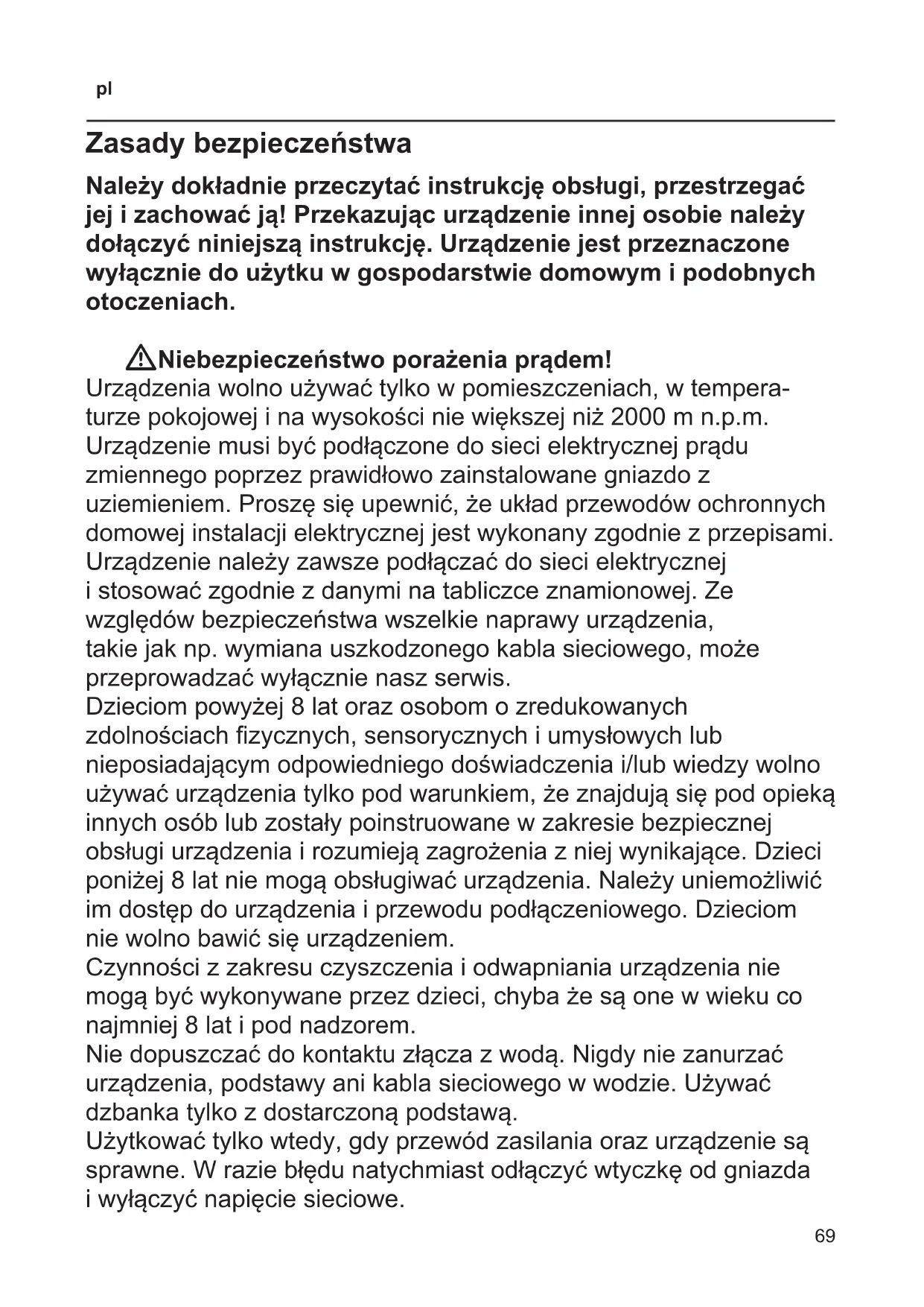Zasady bezpieczeństwa Należy dokładnie przeczytać instrukcję obsługi, przestrzegać jej i zachować ją! Przekazując urządzenie innej osobie należy dołączyć niniejszą instrukcję. Urządzenie jest przeznaczone wyłącznie do użytku w gospodarstwie domowym i podobnych otoczeniach. WNiebezpieczeństwo porażenia prądem! Urządzenia wolno używać tylko w pomieszczeniach, w tempera turze pokojowej i na wysokości nie większej niż 2000 m n.p.m. Urządzenie musi być podłączone do sieci elektrycznej prądu zmiennego poprzez prawidłowo zainstalowane gniazdo z uziemieniem. Proszę się upewnić, że układ przewodów ochronnych domowej instalacji elektrycznej jest wykonany zgodnie z przepisami. Urządzenie należy zawsze podłączać do sieci elektrycznej i stosować zgodnie z danymi na tabliczce znamionowej. Ze względów bezpieczeństwa wszelkie naprawy urządzenia, takie jak np. wymiana uszkodzonego kabla sieciowego, może przeprowadzać wyłącznie nasz serwis. Dzieciom powyżej 8 lat oraz osobom o zredukowanych zdolnościach zycznych, sensorycznych i umysłowych lub nieposiadającym odpowiedniego doświadczenia i/lub wiedzy wolno używać urządzenia tylko pod warunkiem, że znajdują się pod opieką innych osób lub zostały poinstruowane w zakresie bezpiecznej obsługi urządzenia i rozumieją zagrożenia z niej wynikające. Dzieci poniżej 8 lat nie mogą obsługiwać urządzenia. Należy uniemożliwić im dostęp do urządzenia i przewodu podłączeniowego. Dzieciom nie wolno bawić się urządzeniem. Czynności z zakresu czyszczenia i odwapniania urządzenia nie mogą być wykonywane przez dzieci, chyba że są one w wieku co najmniej 8 lat i pod nadzorem. Nie dopuszczać do kontaktu złącza z wodą. Nigdy nie zanurzać urządzenia, podstawy ani kabla sieciowego w wodzie. Używać dzbanka tylko z dostarczoną podstawą. Użytkować tylko wtedy, gdy przewód zasilania oraz urządzenie są sprawne. W razie błędu natychmiast odłączyć wtyczkę od gniazda i wyłączyć napięcie sieciowe.70