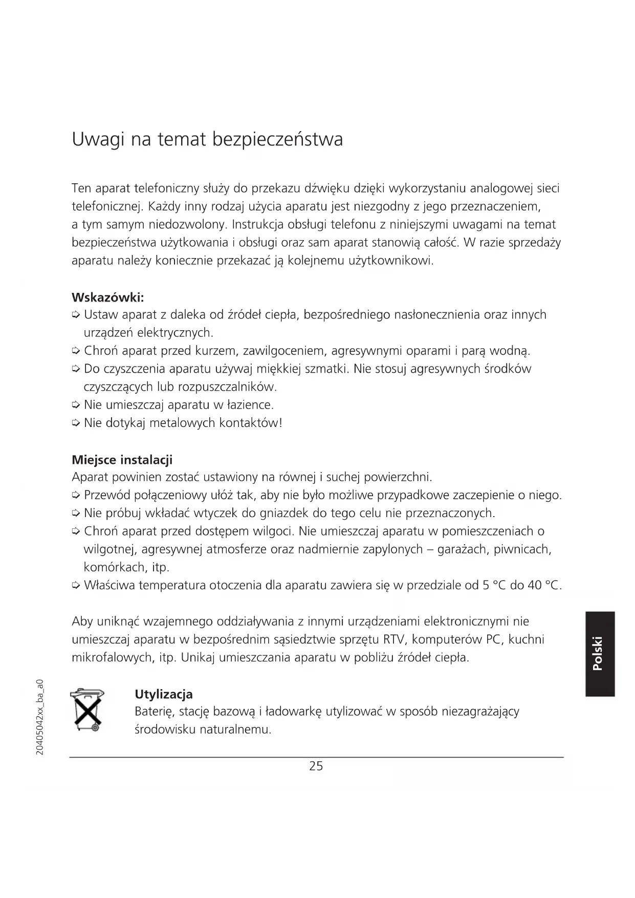 teléfono a la toma de la pared utilizando el adaptador correspondiente.23 20405042xx_ba_a0 Español Aceptar una llamada Al recibir una llamada, se oirá el timbre del teléfono. Para aceptar la llamada, levante el auricular. Al finalizar la conversación, vuelva a colocar el auricular en su lugar. Realizar una llamada Levante el auricular, espere a oír el tono y marque el número deseado. Al finalizar la conversación, vuelva a colocar el auricular en su lugar. Volver a llamar al último número marcado El último número marcado se almacenará en una memoria temporal que se actualiza cada vez que se marca un número nuevo. Para volver a llamar al último número marcado, pulse la tecla central. Insertar pausas de marcación Al marcar un número de teléfono, puede insertar una pausa de marcación entre dos dígitos pulsando la tecla central. La pausa de marcación se almacenará en la memoria de rellamada junto con el número. Si vuelve a llamar a éste, se marcará automáticamente la pausa. Utilización del teléfono24 20405042xx_ba_a0 Homologación y conformidad Este teléfono analógico con cable cumple las cláusulas establecidas en la Directiva 1999/5/CE R&TTE sobre equipos radioeléctricos y equipos terminales de telecomunicación, y está destinado para su uso en el país indicado en el teléfono y/o en el embalaje. La declaración de conformidad se encuentra al final del presente manual. La marca CE confirma la conformidad del aparato con respecto a la Directiva mencionada. Condiciones de la garantía Su Vintage 20 está sujeto a garantía a partir de la fecha de compra, de acuerdo con las cláusulas legales del país en el que haya sido adquirido. Como prueba de la compra, le aconsejamos que conserve el recibo o la tarjeta de garan- tía cumplimentada por su proveedor. Dentro del periodo de validez de la garantía, se cor- regirá, de forma gratuita, cualquier defecto de los materiales o de fabricación, ya sea reparando o sustituyendo el aparato. Quedan excluidos de la garantía cualquier material consumible (baterías), los defectos que afecten al valor o al uso del aparato de forma insignificante y cualquier daño causa- do por un uso incorrecto del aparato, el desgaste natural o la manipulación del aparato por parte de un tercero. Asimismo, queda excluido de la garantía cualquier daño o fallo causado por el uso, o si el problema está provocado por un equipo defectuoso. De manera particular, el fabricante no será responsable de ningún daño a la propiedad o de pérdida de capital. Para cualquier reclamación incluida en la presente garantía, póngase en contacto con el punto de venta en que adquirió su aparato. Información general25 20405042xx_ba_a0 Polski Uwagi na temat bezpieczeństwa Ten aparat telefoniczny służy do przekazu dźwięku dzięki wykorzystaniu analogowej sieci telefonicznej. Każdy inny rodzaj użycia aparatu jest niezgodny z jego przeznaczeniem, a tym samym niedozwolony. Instrukcja obsługi telefonu z niniejszymi uwagami na temat bezpieczeństwa użytkowania i obsługi oraz sam aparat stanowią całość. W razie sprzedaży aparatu należy koniecznie przekazać ją kolejnemu użytkownikowi. Wskazówki: ➭ Ustaw aparat z daleka od źródeł ciepła, bezpośredniego nasłonecznienia oraz innych urządzeń elektrycznych. ➭ Chroń aparat przed kurzem, zawilgoceniem, agresywnymi oparami i parą wodną. ➭ Do czyszczenia aparatu używaj miękkiej szmatki. Nie stosuj agresywnych środków czyszczących lub rozpuszczalników. ➭ Nie umieszczaj aparatu w łazience. ➭ Nie dotykaj metalowych kontaktów! Miejsce instalacji Aparat powinien zostać ustawiony na równej i suchej powierzchni. ➭ Przewód połączeniowy ułóż tak, aby nie było możliwe przypadkowe zaczepienie o niego. ➭ Nie próbuj wkładać wtyczek do gniazdek do tego celu nie przeznaczonych. ➭ Chroń aparat przed dostępem wilgoci. Nie umieszczaj aparatu w pomieszczeniach o wilgotnej, agresywnej atmosferze oraz nadmiernie zapylonych – garażach, piwnicach, komórkach, itp. ➭ Właściwa temperatura otoczenia dla aparatu zawiera się w przedziale od 5 °C do 40 °C. Aby uniknąć wzajemnego oddziaływania z innymi urządzeniami elektronicznymi nie umieszczaj aparatu w bezpośrednim sąsiedztwie sprzętu RTV, komputerów PC, kuchni mikrofalowych, itp. Unikaj umieszczania aparatu w pobliżu źródeł ciepła. Utylizacja Baterię, stację bazową i ładowarkę utylizować w sposób niezagrażający środowisku naturalnemu.26 20405042xx_ba_a0 Ustawienie, uruchomienie i przygotowanie do użytkowania Zawartość opakowania ➭ 1 aparat telefoniczny Vintage 20 ➭ 1 słuchawka z przewodem spiralnym ➭ 1 przewód połączeniowy ➭ 1 instrukcja obsługi Widok aparatu Podstawowe funkcje ➭ Ponowne wybieranie ostatniego numeru ➭ Automatyczne dodawanie pauzy wybierania ➭ Regulacja głośności dzwonka (2 poziomy) ➭ Ustawianie trybu wybierania – DMTF lub impulsowy Przełącznik trybu wybierania (z tyłu aparatu) Gniazdko przewodu słuchawkowego (z tyłu aparatu) Przycisk ponownego wybierania/pauzy wybierania Przełącznik głośności (z tyłu aparatu) Gniazdko przewodu połączeniowego (z tyłu aparatu)27 20405042xx_ba_a0 Polski Ustawienie, uruchomienie i przygotowanie do użytkowania Podłączanie aparatu Głośność dzwonka Aparat Vintage 20 posiada przełącznik głośności dzwonka oznaczony RINGER z tyłu obudowy. Ustaw głośność dzwonka na jednym z dwóch dostępnych poziomów (głośny – HIGH, cicho – LOW): Głośno: HI Cicho: LOW Tryb wybierania Aparat może wybierać numery tonowo (DTMF) lub impulsowo. Zapytaj operatora jaki tryb wybierania jest właściwy dla Twojej lokalizacji. Ustaw PULSE aby włączyć tryb wybierania impulsowego. Ustaw TONE aby włączyć tryb wybierania tonowego (DTMF).