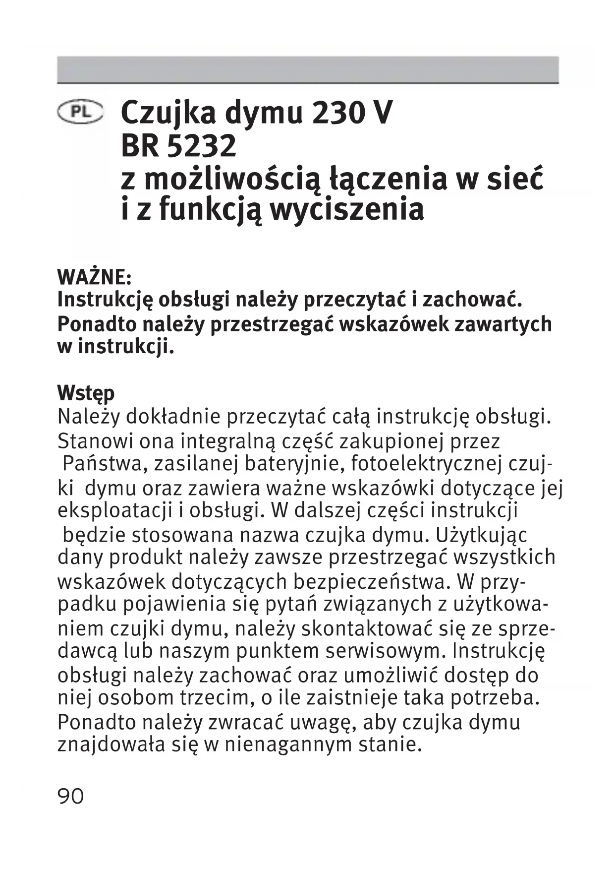 BR 5232 Manual de instrucciones 052109 Rauchmelder BR 5232 02.06.2009 19:19 Uhr90 Czujka dymu 230 V BR 5232 z możliwością łączenia w sieć i z funkcją wyciszenia WAŻNE: Instrukcję obsługi należy przeczytać i zachować. Ponadto należy przestrzegać wskazówek zawartych w instrukcji. Wstęp Należy dokładnie przeczytać całą instrukcję obsługi. Stanowi ona integralną część zakupionej przez Państwa, zasilanej bateryjnie, fotoelektrycznej czuj- ki dymu oraz zawiera ważne wskazówki dotyczące jej eksploatacji i obsługi. W dalszej części instrukcji będzie stosowana nazwa czujka dymu. Użytkując dany produkt należy zawsze przestrzegać wszystkich wskazówek dotyczących bezpieczeństwa. W przy- padku pojawienia się pytań związanych z użytkowa- niem czujki dymu, należy skontaktować się ze sprze- dawcą lub naszym punktem serwisowym. Instrukcję obsługi należy zachować oraz umożliwić dostęp do niej osobom trzecim, o ile zaistnieje taka potrzeba. Ponadto należy zwracać uwagę, aby czujka dymu znajdowała się w nienagannym stanie. 052109 Rauchmelder BR 5232 02.06.2009 19:19 UhrDane techniczne Urządzenie: BR 5232 Certyfikaty: EN 14604 Stopień ochrony: IP 20 Bateria rezerwowa: 9 V DC bateria węglo - wo-cynkowa (IEC 6F22) / bateria alkaliczna (IEC 6LR61) lub MN1604 W przypadku przerwy w zasilaniu prądem bateria zasila czujkę przez co najmniej 1 rok Prąd maks.: < 20 mA (alarm) Temperatura otoczenia: 0 °C – 40 °C Względna wilgotność powietrza: 10 %- 90 % Głośność sygnalizatora dźwiękowego: 85 dB (pomiar z odległo- ści 3 m) Żywotność baterii: min. 1 rok Łączenie w sieć: maks. 12 czujek dymu przy maks. długości kabla 40 m pomiędzy poszczególnymi urządzeniami