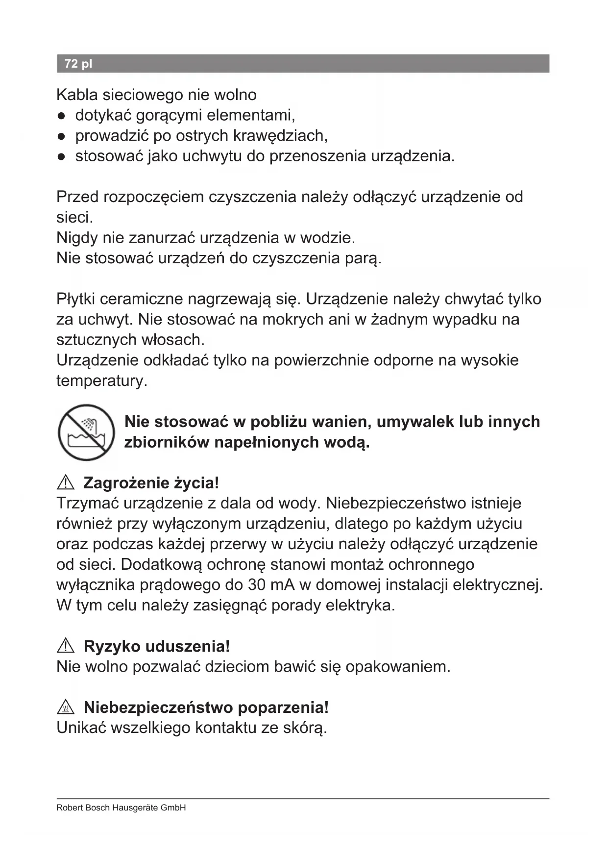 Robert Bosch Hausgeräte GmbH 72 pl Kabla sieciowego nie wolno ● dotykać gorącymi elementami, ● prowadzić po ostrych krawędziach, ● stosować jako uchwytu do przenoszenia urządzenia. Przed rozpoczęciem czyszczenia należy odłączyć urządzenie od sieci. Nigdy nie zanurzać urządzenia w wodzie. Nie stosować urządzeń do czyszczenia parą. Płytki ceramiczne nagrzewają się. Urządzenie należy chwytać tylko za uchwyt. Nie stosować na mokrych ani w żadnym wypadku na sztucznych włosach. Urządzenie odkładać tylko na powierzchnie odporne na wysokie temperatury. Nie stosować w pobliżu wanien, umywalek lub innych zbiorników napełnionych wodą.