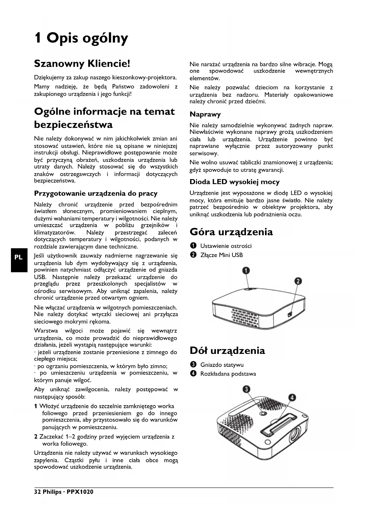 - po umieszczeniu urządzenia w pomieszczeniu, w którym panuje wilgoć. Aby uniknąć zawilgocenia, należy postępować w następujący sposób: 1 Włożyć urządzenie do szczelnie zamkniętego worka foliowego przed przeniesieniem go do innego pomieszczenia, aby przystosowało się do warunków panujących w pomieszczeniu. 2 Zaczekać 1–2 godziny przed wyjęciem urządzenia z worka foliowego. Urządzenia nie należy używać w warunkach wysokiego zapylenia. Urządzenia nie należy używać w warunkach wysokiego zapylenia. Cząstki pyłu i inne ciała obce mogą spowodować uszkodzenie urządzenia. Nie narażać urządzenia na bardzo silne wibracje Nie narażać urządzenia na bardzo silne wibracje. Mogą one spowodować uszkodzenie wewnętrznych elementów. Nie należy pozwalać dzieciom na korzystanie z urządzenia bez nadzoru. Nie należy pozwalać dzieciom na korzystanie z urządzenia bez nadzoru. Materiały opakowaniowe należy chronić przed dziećmi. Naprawy Naprawy Nie należy samodzielnie wykonywać żadnych napraw. Niewłaściwie wykonane naprawy grożą uszkodzeniem ciała lub urządzenia. Urządzenie powinno być naprawiane wyłącznie przez autoryzowany punkt serwisowy. Nie wolno usuwać tabliczki znamionowej z urządzenia; gdyż spowoduje to utratę gwarancji. Dioda LED wysokiej mocy Urządzenie jest wyposażone w diodę LED o wysokiej mocy, która emituje bardzo jasne światło. Nie należy patrzeć bezpośrednio w obiektyw projektora, aby uniknąć uszkodzenia lub podrażnienia oczu. Góra urządzenia ‚ Ustawienie ostrości ƒ Złącze Mini USB PicoPix P1 oben Dół urządzenia „ Gniazdo statywu … Rozkładana podstawa PicoPix P1 unten ppx1020_manual_11_pl_253345797-b.book Seite 32 Freitag, 17. September 2010 12:09 12Podstawowe zasady obsługi 33