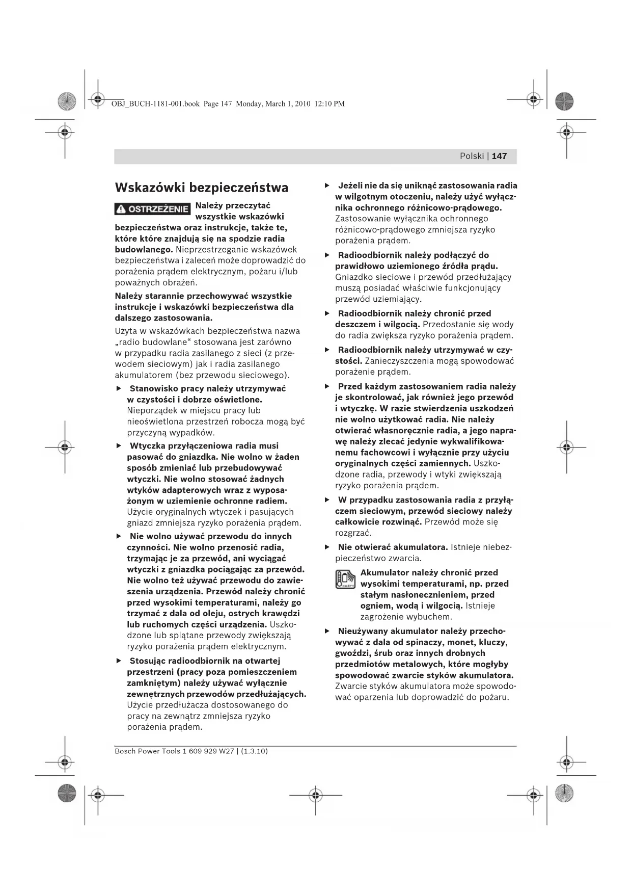 Zadziałało wewnętrzne zabezpieczenie termiczne Usunąć zewnętrzne urządzenie i doprowa- dzić do ochłodzenia radioodbiornika Radioodbiornik nieoczekiwanie przestaje działać Wtyczka lub akumulator nie zostały włożone, lub uczynione zostało to niedokładnie Całkowicie włożyć wtyczkę bądź akumulator Błędy w oprogra- mowaniu Aby zresetować opro- gramowanie, należy wyjąć wtyczkę z gniazdka lub usunąć akumulator, a następ- nie – po odczekaniu 30 sekund – ponow- nie włożyć wtyczkę lub akumulator na miejsce. Zły odbiór radiowy Zakłócenia spowodo- wane innymi urządze- niami lub niekorzyst- nymi warunkami w miejscu umieszcze- nia radioodbiornika Umieścić radio- odbiornik w innym miejscu, gdzie jest lepszy odbiór Antena nie została ustawiona w sposób optymalny Przekręcić antenę Zakłócenia w wyświetlaniu czasu Baterie buforowe dla zegara wyładowały się Wymienić baterie buforowe Niewłaściwie ułożone baterie (bieguny) Baterie buforowe ułożyć we wnęce zważając na zacho- wanie właściwej biegunowości Przyczyna Usuwanie błędu OBJ_BUCH-1181-001.book Page 156 Monday, March 1, 2010 12:10 PMPolski | 157 Bosch Power Tools 1 609 929 W27 | (1.3.10) Konserwacja i serwis Konserwacja i czyszczenie f Przewód sieciowy zaopatrzony został w specjalne przyłącze bezpieczeństwa i jego wymiany można dokonywać wyłącz- nie w autoryzowanym punkcie serwisowym firmy Bosch. Jeśli radio, mimo starannych metod produkcji i kontroli uległoby awarii, naprawy powinien dokonać autoryzowany serwis elektronarzędzi firmy Bosch. W razie ewentualnych pytań, a także przy wszelkich zgłoszeniach i zamówieniach części zamiennych konieczne jest podanie dziesięcio- cyfrowego numeru katalogowego, znajdującego się na tabliczce znamionowej radia. Obsługa klienta oraz doradztwo techniczne Ze wszystkimi pytaniami, dotyczącymi naprawy i konserwacji nabytego produktu oraz dostępu do części zamiennych prosimy zwracać się do punktów obsługi klienta. Rysunki techniczne oraz informacje o częściach zamiennych można znaleźć pod adresem: www.bosch-pt.com Zespół doradztwa technicznego firmy Bosch służy pomocą w razie pytań związanych z zaku- pem produktu, jego zastosowaniem oraz regu- lacją urządzeń i osprzętu. Polska Robert Bosch Sp. z o.o. Serwis Elektronarzędzi Ul. Szyszkowa 35/37 02-285 Warszawa Tel.: +48 (022) 715 44 60 Faks: +48 (022) 715 44 41 E-Mail: bsc@pl.bosch.com Infolinia Działu Elektronarzędzi: +48 (801) 100 900 (w cenie połączenia lokalnego) E-Mail: elektronarzedzia.info@pl.bosch.com www.bosch.pl Transport Akumulatory można wysyłać tylko wówczas, gdy ich obudowa nie jest uszkodzona. Odsłonięte styki należy zakleić, a akumulator zapakować w taki sposób, aby nie mógł on się poruszać (przesuwać) w opakowaniu. Przy wysyłce akumulatorów litowo-jonowych może istnień obowiązek znakowania przesyłki – prosimy o przestrzeganie odpowiednich przepisów krajowych. Usuwanie odpadów Radio, osprzęt i opakowanie należy oddać do po- wtórnego przetworzenia zgodnego z obowiązu- jącymi przepisami w zakresie ochrony środowiska. Tylko dla państw należących do UE: Nie wolno wyrzucać radia i akumu- latorów do odpadów domowych! Zgodnie z europejską wytyczną 2002/96/EG o starych, zużytych narzędziach elektrycznych i elek- tronicznych i jej stosowania w pra- wie krajowym, wyeliminowane niezdatne do użycia narzędzia elektryczne i elektroniczne, a także akumulatory należy zbierać osobno i do- prowadzić do ponownego przetworzenia zgodnego z zasadami ochrony środowiska. Akumulatory/Baterie: Li-Ion: Proszę stosować się do wskazówek, znajdujących się w rozdziale „Transport“, str. 157. Zużytych akumulatorów/baterii nie należy wyrzucać do odpadów z gospodarstwa domowego, nie wolno ich też wrzucać do ognia ani do wody. Akumulatory/baterie należy zbierać i oddać do ponownego przetworzenia lub zlikwidować zgodnie z aktualnie obowiązującymi ustawowymi przepisami dotyczącymi ochrony środowiska, w razie możliwości po uprzednim ich rozładowaniu. Tylko dla państw należących do UE: Zgodnie z europejską wytyczną 2006/66/WE uszkodzone lub zużyte akumulatory/baterie muszą zostać poddane utylizacji. Zastrzega się prawo dokonywania zmian. OBJ_BUCH-1181-001.book Page 157 Monday, March 1, 2010 12:10 PM158 | Česky 1 609 929 W27 | (1.3.10) Bosch Power Tools