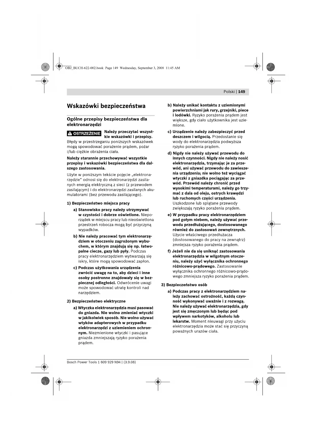 narzędzi a) Nie należy przeciążać urządzenia. Do pracy używać należy elektronarzędzia, które są do tego przewidziane. Odpo- wiednio dobranym elektronarzędziem pracuje się w danym zakresie wydajności lepiej i bezpieczniej. b) Nie należy używać elektronarzędzia, którego włącznik/wyłącznik jest uszko- dzony. Elektronarzędzie, którego nie można włączyć lub wyłączyć jest niebez- pieczne i musi zostać naprawione. c) Przed regulacją urządzenia, wymianą osprzętu lub po zaprzestaniu pracy na- rzędziem, należy wyciągnąć wtyczkę z gniazda i/lub usunąć akumulator. Ten środek ostrożności zapobiega nieza- mierzonemu włączeniu się elektro- narzędzia. d) Nieużywane elektronarzędzia należy przechowywać w miejscu niedostępnym dla dzieci. Nie należy udostępniać narzę- dzia osobom, które go nie znają lub nie przeczytały niniejszych przepisów. Używane przez niedoświadczone osoby elektronarzędzia są niebezpieczne. e) Konieczna jest należyta konserwacja elektronarzędzia. Należy kontrolować, czy ruchome części urządzenia działają bez zarzutu i nie są zablokowane, czy części nie są pęknięte lub uszkodzone w taki sposób, który miałby wpływ na prawidłowe działanie elektronarzędzia. Uszkodzone części należy przed użyciem urządzenia oddać do naprawy. Wiele wypadków spowodowanych jest przez niewłaściwą konserwację elektro- narzędzi. f) Należy stale dbać o ostrość i czystość narzędzi tnących. O wiele rzadziej docho- dzi do zakleszczenia się narzędzia tnącego, jeżeli jest ono starannie utrzyma- ne. Zadbane narzędzia łatwiej się też pro- wadzi. OBJ_BUCH-622-002.book Page 150 Wednesday, September 3, 2008 11:45 AMPolski | 151 Bosch Power Tools 1 609 929 N94 | (3.9.08) g) Elektronarzędzia, osprzęt, narzędzia pomocnicze itd. należy używać zgodnie z niniejszymi zaleceniami. Uwzględnić należy przy tym warunki i rodzaj wykony- wanej pracy. Niezgodne z przeznacze- niem użycie elektronarzędzia może dopro- wadzić do niebezpiecznych sytuacji.