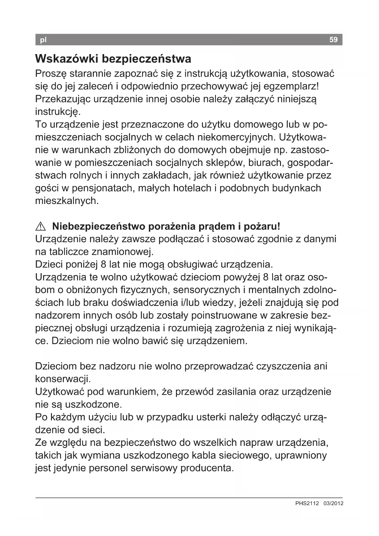 Zagrożenie życia! Trzymać urządzenie z dala od wody. Niebezpieczeństwo istnieje również przy wyłączonym urządzeniu, dlatego po każdym użyciu oraz podczas każdej przerwy w użyciu należy odłączyć urządzenie od sieci. Dodatkową ochronę stanowi montaż ochronnego wyłącz- nika prądowego do 30 mA w domowej instalacji elektrycznej. W tym celu należy zasięgnąć porady elektryka.