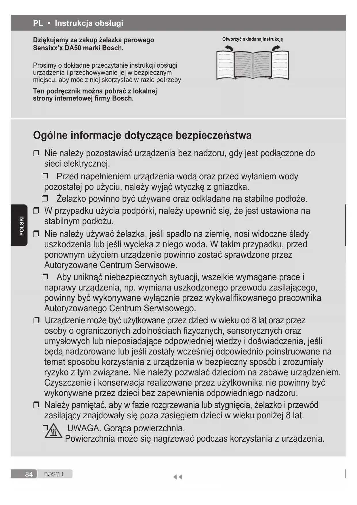 UWAGA. Gorąca powierzchnia. Powierzchnia może się nagrzewać podczas korzystania z urządzenia. PL • Instrukcja obsługi Dziękujemy za zakup żelazka parowego Sensixx’x DA50 marki Bosch. Prosimy o dokładne przeczytanie instrukcji obsługi urządzenia i przechowywanie jej w bezpiecznym miejscu, aby móc z niej skorzystać w razie potrzeby. Ten podręcznik można pobrać z lokalnej strony internetowej rmy Bosch. Otworzyć składaną instrukcję85 B O S C H