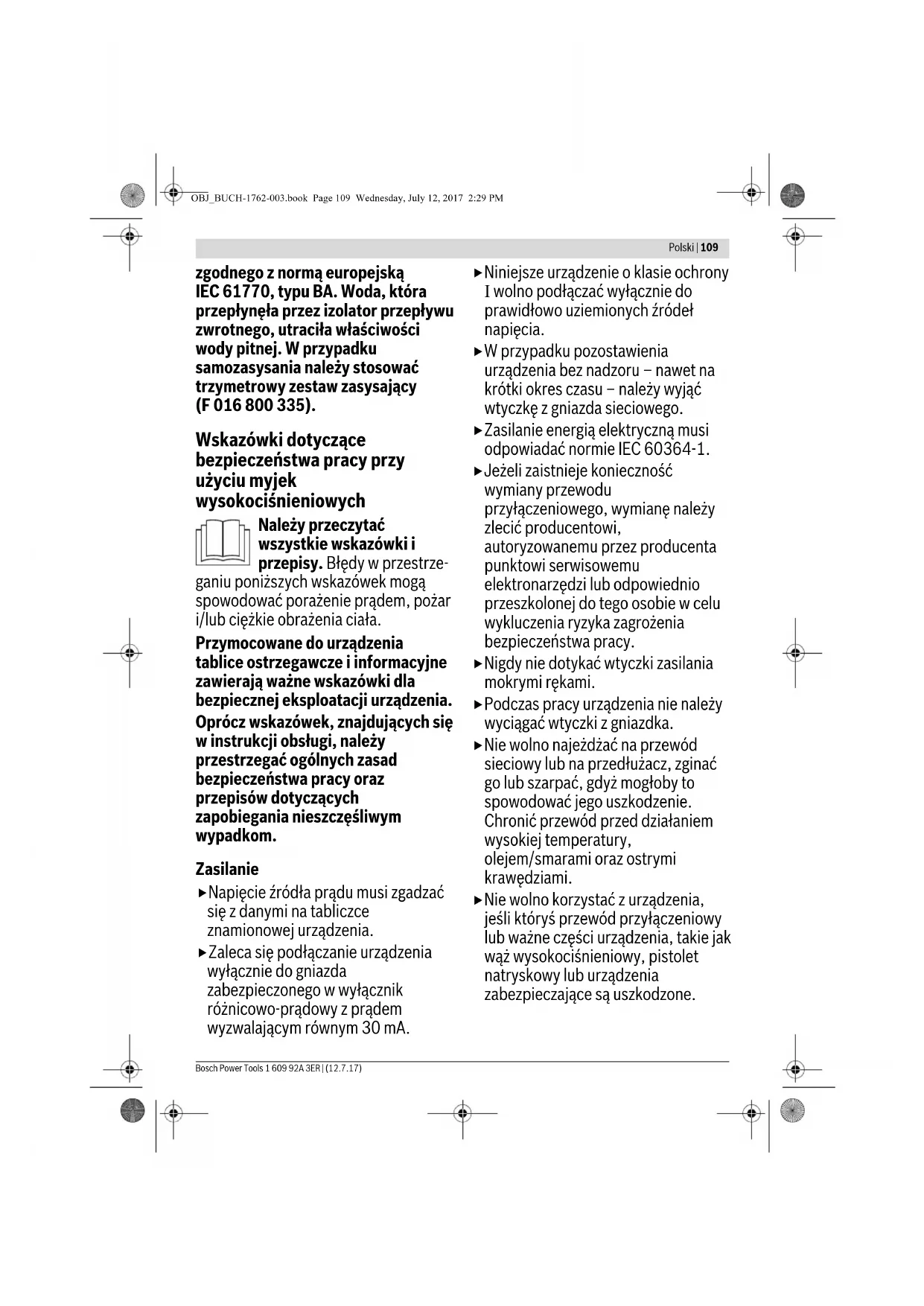 Impedancja źródła zasilania Ciężar odpowiednio do EPTA-Procedure 01:2014 kg 23,4 25,6 Klasa ochrony /I /I Numer seryjny Zob. numer seryjny (tabliczka znamionowa) na myjce wysokociśnieniowej Dane aktualne są dla napięcia znamionowego [U] 230 V. Przy napięciach odbiegających od powyższego i w przypadku modeli specyficznych dla danego kraju dane te mogą się różnić. Podczas włączania urządzenia dochodzi do krótkotrwałych spadków napięcia. W przypadku niekorzystnych warunków sieciowych może dojść co zakłóceń pracy innych urządzeń. W przypadku impedancji źródła zasilania mniejszej niż 0,32 omów, nie należy się liczyć z żadnymi zakłóceniami. OBJ_BUCH-1762-003.book Page 113 Wednesday, July 12, 2017 2:29 PM Ω 0,32 0,32114 | Polski 1 609 92A 3ER | (12.7.17) Bosch Power Tools Informacja na temat hałasu i wibracji Montaż i praca Uruchomienie urządzenia Dla własnego bezpieczeństwa Uwaga! Przed przystąpieniem do czynności konserwacyjnych lub czyszczenia, należy wyłączyć narzędzie ogrodowe i wyjąć przewód z gniazda. Powyższe zalecenie dotyczy również przypadków, gdy przewód zasilający jest przecięty, uszkodzony lub splątany. Nabyte narzędzie ogrodowe jest zaopatrzone w izolację ochronną i nie wymaga uziemienia. Napięcie robocze wynosi 230 V AC, 50 Hz (dla krajów nie należących do UE 220 V lub 240 V). Dla podwyższenia bezpieczeństwa pracy należy stosować wyłącznik różnicowoprądowy (RCD) o prądzie różnicowym, nie większym niż 30 mA. Wyłącznik ten powinien być kontrolowany przed każdym użyciem. Przewód sieciowy i przedłużacze należy regularnie kontrolować pod kątem uszkodzeń. Przewody te wolno użytkować wyłącznie w nienagannym stanie. Jeżeli konieczna okaże się wymiana przewodu przyłączeniowego, należy zlecić ją firmie Bosch lub w autoryzowanym przez firmę Bosch punkcie naprawy elektronarzędzi, co pozwoli uniknąć ryzyka zagrożenia bezpieczeństwa. Stosować wolno jedynie atestowane przedłużacze. UWAGA: Przedłużacze niezgodne z przepisami mogą stanowić zagrożenie. Przedłużacz, wtyczka i łącznik wtykowy powinny mieć wodoszczelną budowę i być przeznaczone do zastosowań na zewnątrz pomieszczeń. Stosować wolno wyłącznie przedłużacze, przewody i bębny na kable odpowiadające normom EN 61242 / IEC 61242 lub IEC 60884-2-7. Jeżeli do pracy z urządzeniem konieczne jest użycie przedłużacza, wymagane są następujące przekroje przewodu: – średnica przewodu 1,5 mm
