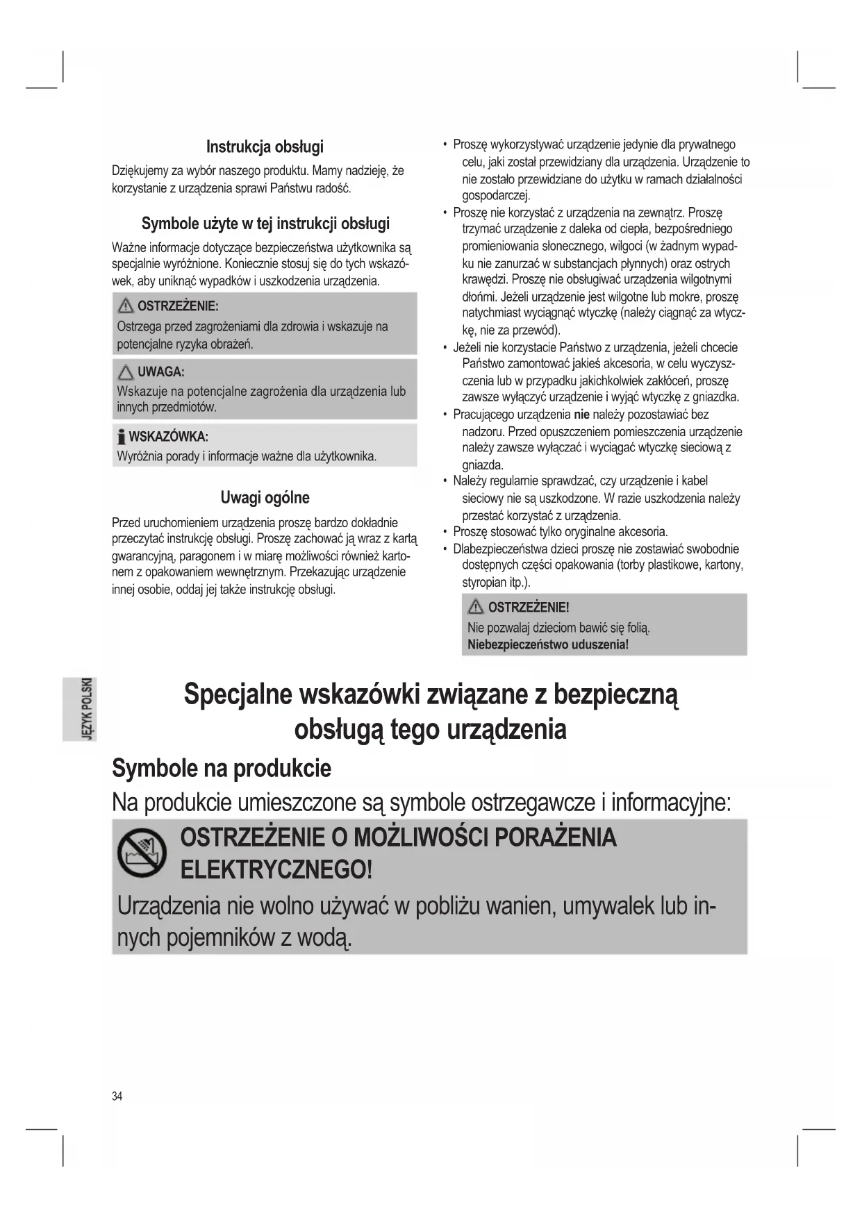 OSTRZEŻENIE O MOŻLIWOŚCI PORAŻENIA ELEKTRYCZNEGO!