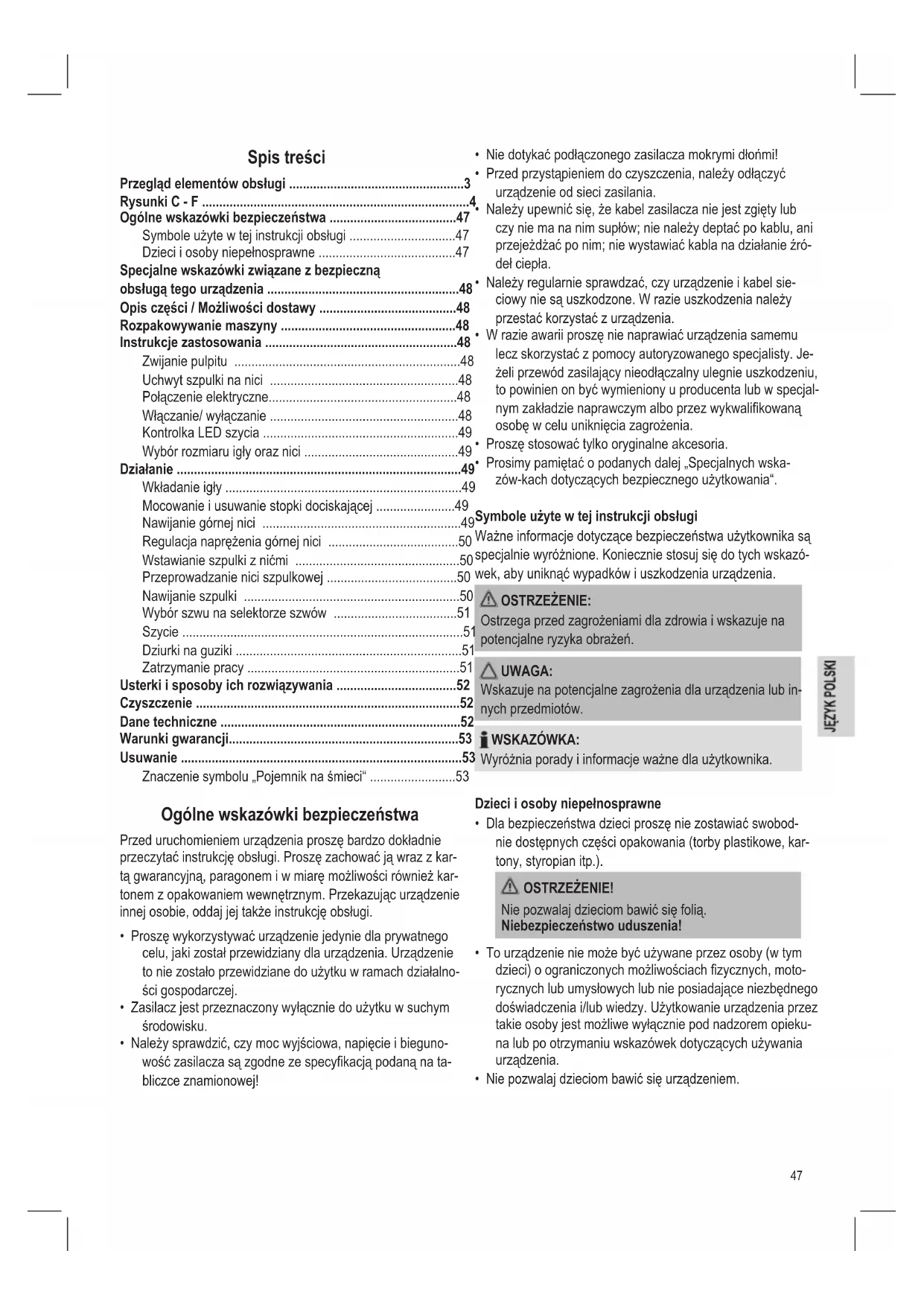 Przed uruchomieniem urzadzenia prosze bardzo dokladnie przyczytc instrukcje obstugi. Prosze zachować ja wraz z karta gwarancyjn, paragonem i w miare moziwość rownikę kartenem z opakowaniem wewétrznym. Przekazujucz urzadzenia inniej osobie, oddaj jej takość instrukcje obstugi.