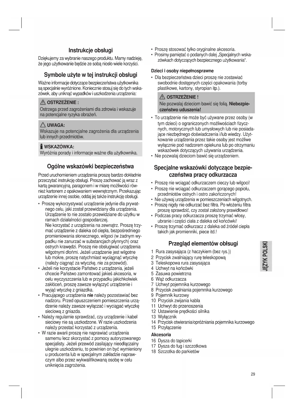 - Proszę trzymać odkurzacz z daleka od źródeł ciepła takich jak promienniki, piece itd.! Przegląd elementów obłsugi 1 Rura zasysająca (z haczykiem (bez rys.)) 2 Przycisk zwalniający rurę teleskopową 3 Teleskopowa rura zasysająca 4 Uchwyt na końcówki 5 Zasuwa powietrzna 6 Wąż odkurzacza 7 Uchwyt pojemnika kurzowego 8 Przycisk zwalniania pojemnika kurzowego 9 Pojemnik kurzowy 10 Przycisk zwijania kabla 11 Uchwyt do przenoszenia 12 Ustawienie prędkości silnika 13 Wyłącznik 14 Przycisk otwierania/opróżniania pojemnika kurzowego 15 Przyłączenie Akcesoria 16 Dysza do tapicerki 17 Dysza do fug i szczotkowa 18 Szczotka do parkietów Instrukcje obsługi Dziękujemy za wybranie naszego produktu. Mamy nadzieję, że jego użytkowanie będzie ze sobą niosło wiele korzyści. Symbole użyte w tej instrukcji obsługi Ważne informacje dotyczące bezpieczeństwa użytkownika są specjalnie wyróżnione. Koniecznie stosuj się do tych wska- zówek, aby uniknąć wypadków i uszkodzenia urządzenia: OSTRZEŻENIE : Ostrzega przed zagrożeniami dla zdrowia i wskazuje na potencjalne ryzyka obrażeń. UWAGA: Wskazuje na potencjalne zagrożenia dla urządzenia lub innych przedmiotów. WSKAZÓWKA: Wyróżnia porady i informacje ważne dla użytkownika. Ogólne wskazówki bezpieczeństwa Przed uruchomieniem urządzenia proszę bardzo dokładnie przeczytać instrukcję obsługi. Proszę zachować ją wraz z kartą gwarancyjną, paragonem i w miarę możliwości rów- nież kartonem z opakowaniem wewnętrznym. Przekazując urządzenie innej osobie, oddaj jej także instrukcję obsługi.