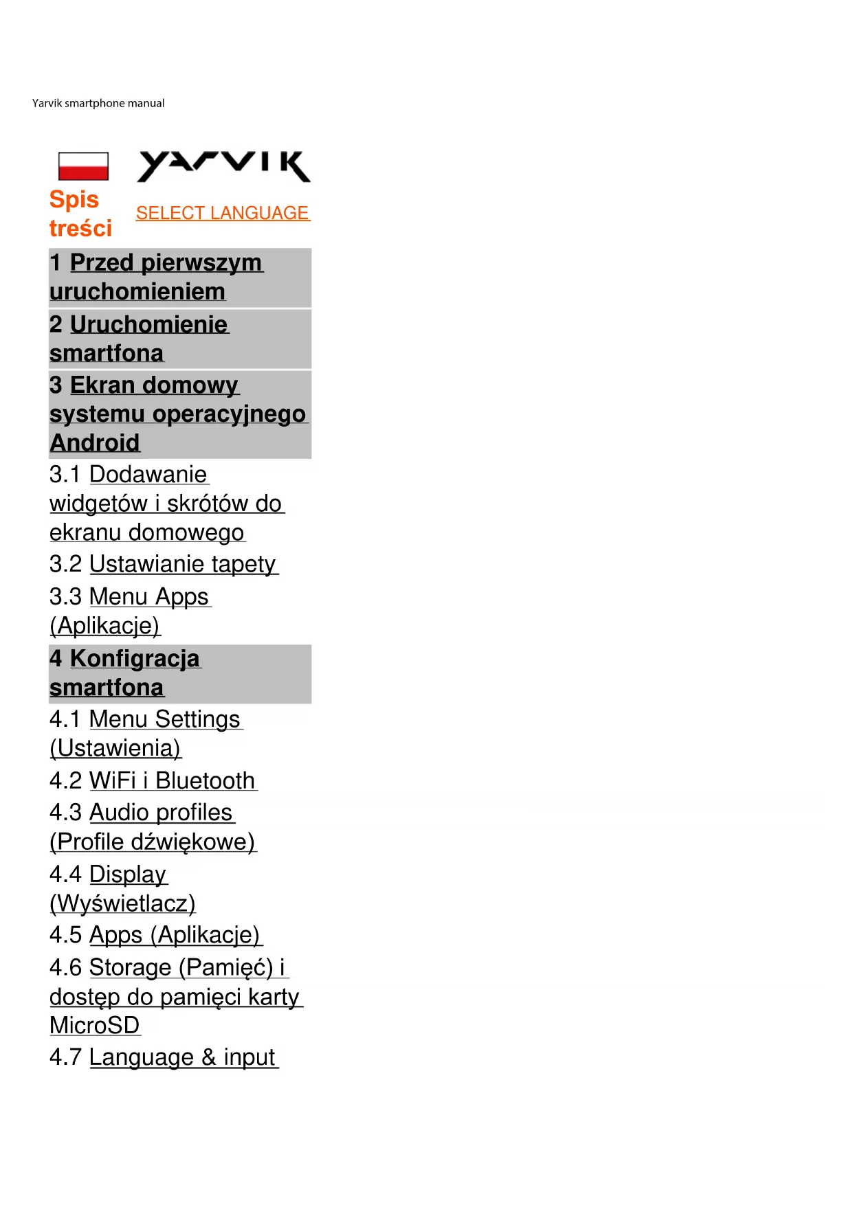 Language & input (Język i sposoby wprowadzania) Za pośrednictwem opcji „Select language” („Wybierz język”) możesz wybrać język wyświetlacza smartfona Yarvik. Ustawienie to będzie obowiązywało dla wszystkich ekranów tekstowych w systemie. Opcja „Android keyboard” („Klawiatura systemu operacyjnego Android”) umożliwia konfigurację klawiatury ekranowej smartfona. Powrót do indeksu