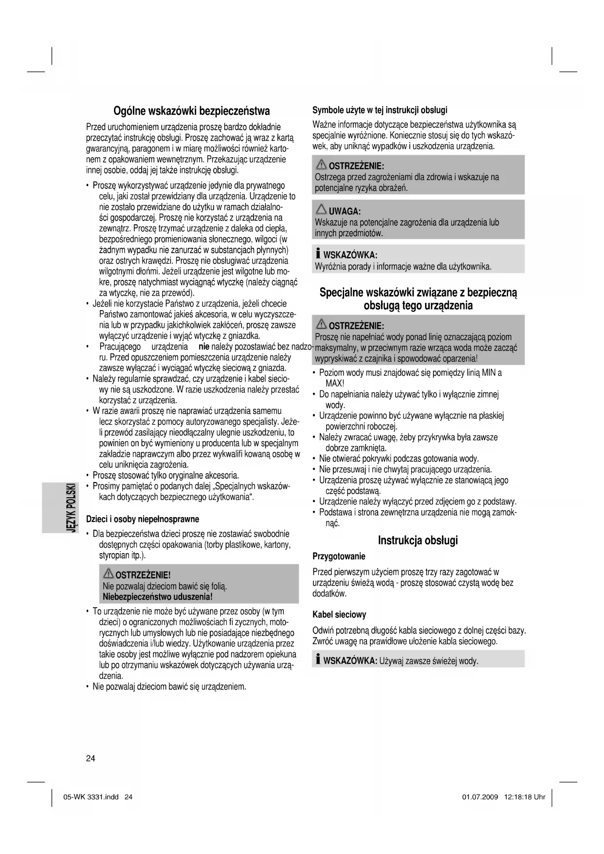 - Podstawa i strona zewnętrzna urządzenia nie mogą zamok- nąć. Instrukcja obsługi Przygotowanie Przed pierwszym użyciem proszę trzy razy zagotować w urządzeniu świeżą wodą - proszę stosować czystą wodę bez dodatków. Kabel sieciowy Odwiń potrzebną długość kabla sieciowego z dolnej części bazy. Zwróć uwagę na prawidłowe ułożenie kabla sieciowego. WSKAZÓWKA: Używaj zawsze świeżej wody. 05-WK 3331.indd 2405-WK 3331.indd 24 01.07.2009 12:18:18 Uhr01.07.2009 12:18:18 Uhr25