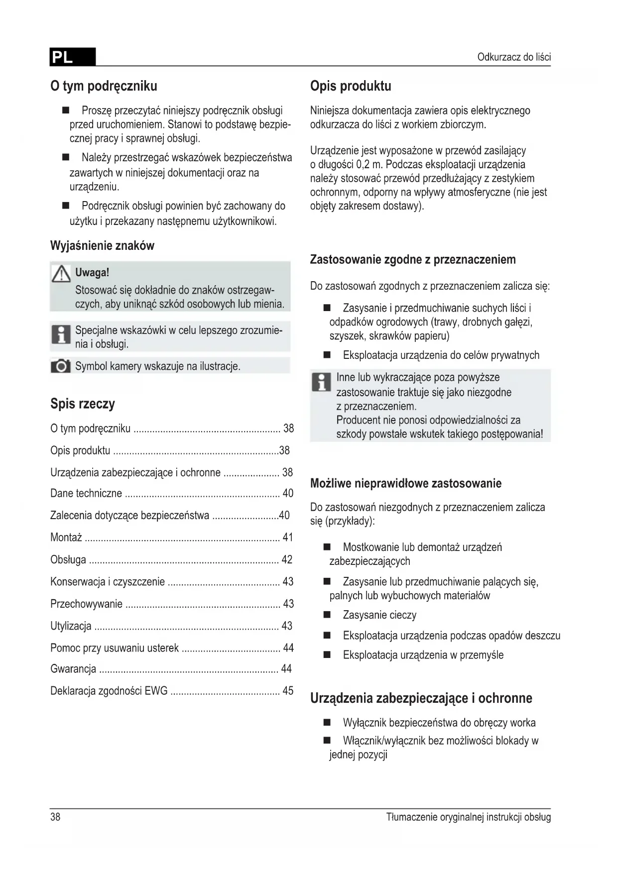 - Odkurzacz do liści Opis produktu Niniejsza dokumentacja zawiera opis elektrycznego odkurzacza do liści z workiem zbiorczym. Urządzenie jest wyposażone w przewód zasilający o długości 0,2 m. Podczas eksploatacji urządzenia należy stosować przewód przedłużający z zestykiem ochronnym, odporny na wpływy atmosferyczne (nie jest objęty zakresem dostawy). Zastosowanie zgodne z przeznaczeniem Do zastosowań zgodnych z przeznaczeniem zalicza się: Zasysanie i przedmuchiwanie suchych liści i odpadków ogrodowych (trawy, drobnych gałęzi, szyszek, skrawków papieru) Eksploatacja urządzenia do celów prywatnych Inne lub wykraczające poza powyższe zastosowanie traktuje się jako niezgodne z przeznaczeniem. Producent nie ponosi odpowiedzialności za szkody powstałe wskutek takiego postępowania! Możliwe nieprawidłowe zastosowanie Do zastosowań niezgodnych z przeznaczeniem zalicza się (przykłady): Mostkowanie lub demontaż urządzeń zabezpieczających Zasysanie lub przedmuchiwanie palących się, palnych lub wybuchowych materiałów Zasysanie cieczy Eksploatacja urządzenia podczas opadów deszczu Eksploatacja urządzenia w przemyśle Urządzenia zabezpieczające i ochronne Wyłącznik bezpieczeństwa do obręczy worka Włącznik/wyłącznik bez możliwości blokady w jednej pozycji O tym podręczniku Proszę przeczytać niniejszy podręcznik obsługi przed uruchomieniem. Stanowi to podstawę bezpie- cznej pracy i sprawnej obsługi. Należy przestrzegać wskazówek bezpieczeństwa zawartych w niniejszej dokumentacji oraz na urządzeniu. Podręcznik obsługi powinien być zachowany do użytku i przekazany następnemu użytkownikowi. Wyjaśnienie znaków Uwaga! Stosować się dokładnie do znaków ostrzegaw- czych, aby uniknąć szkód osobowych lub mienia. Specjalne wskazówki w celu lepszego zrozumie- nia i obsługi. Symbol kamery wskazuje na ilustracje. Spis rzeczy O tym podręczniku p. 38