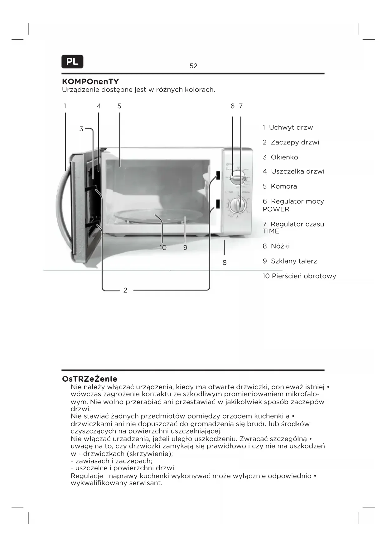 2 Zaczepy drzwi 3 Okienko 7 Regulator czasu TIME 9 Szklany talerz 10 Pierścień obrotowy 4 Uszczelka drzwi 5 Komora 6 Regulator mocy POWER 8 Nóżki 1 Uchwyt drzwi52