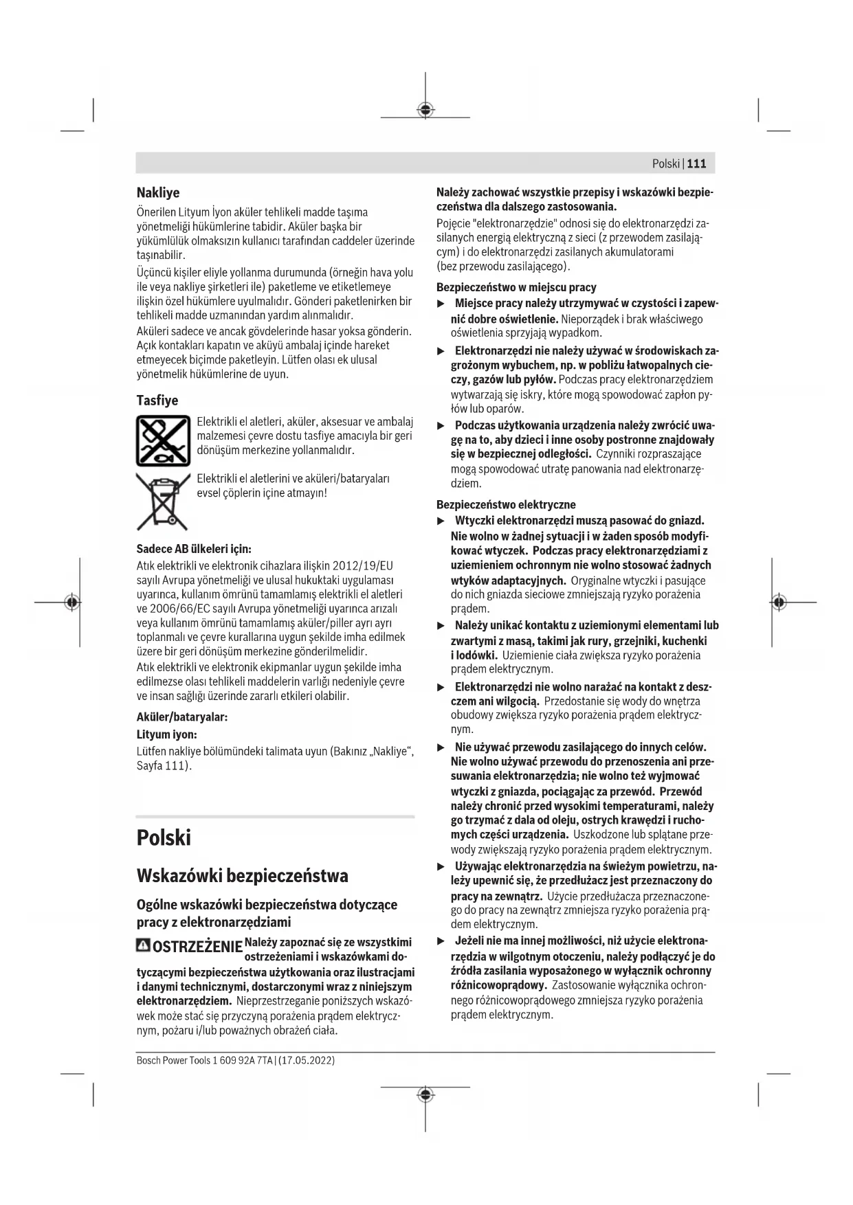 prądem elektrycznym. Bosch Power Tools 1 609 92A 7TA | (17.05.2022)112 | Polski