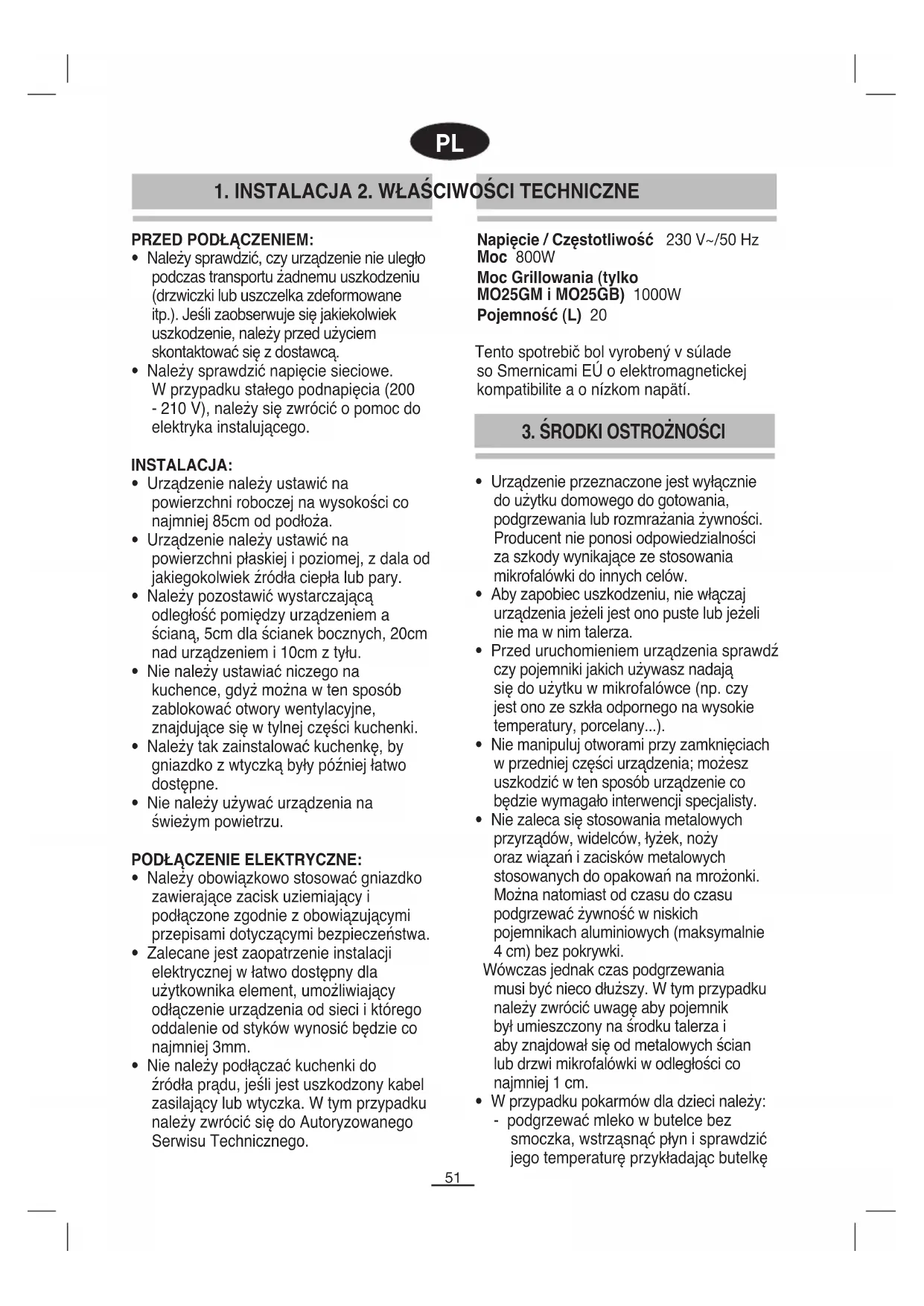 1. INSTALACJA 2. WŁAŚCIWOŚCI TECHNICZNE Napięcie / Częstotliwość 230 V~/50 Hz