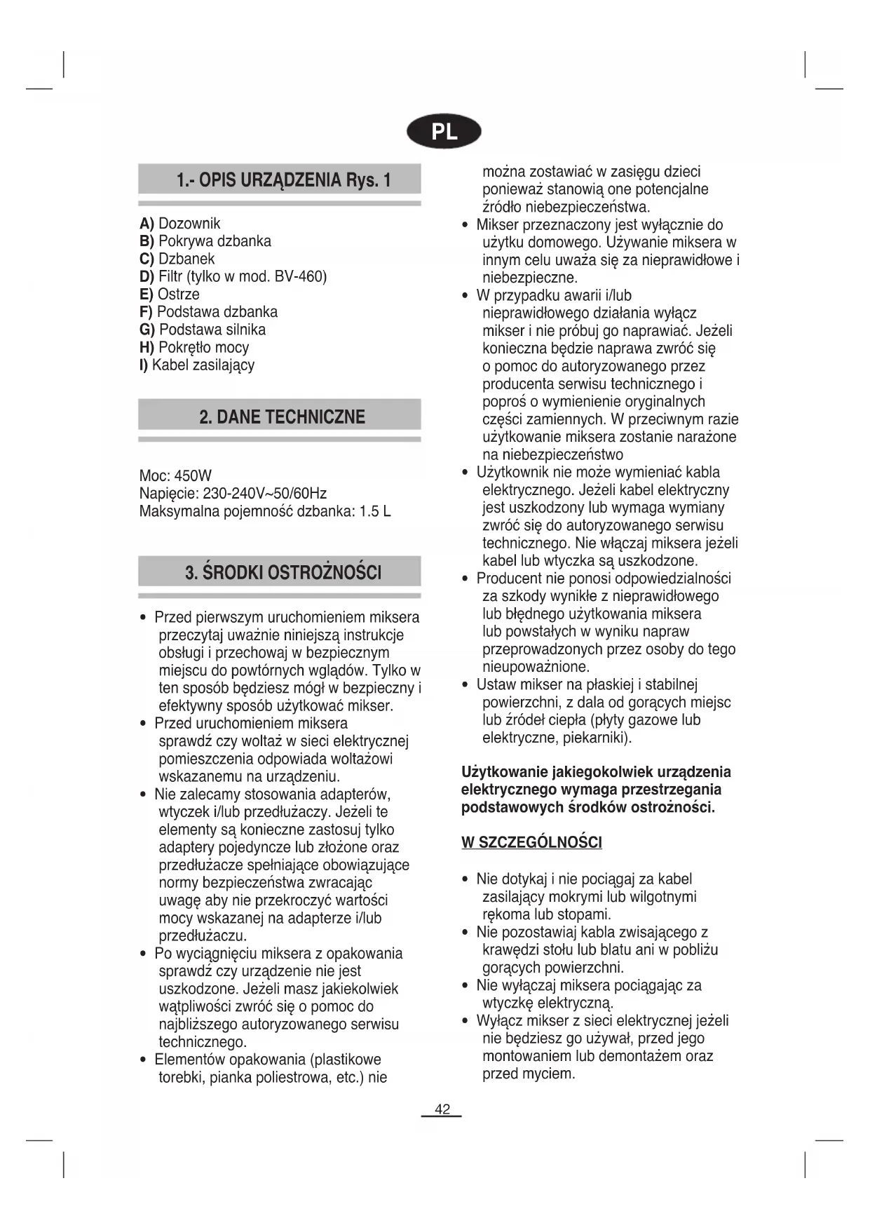A)Dozownik B)Pokrywa dzbanka C)Dzbanek D)Filtr (tylko w mod. BV-460) E)Ostrze F)Podstawa dzbanka G)Podstawa silnika H)Pokrętło mocy I)Kabel zasilający Moc: 450W Napięcie: 230-240V~50/60Hz Maksymalna pojemność dzbanka: 1.5 L