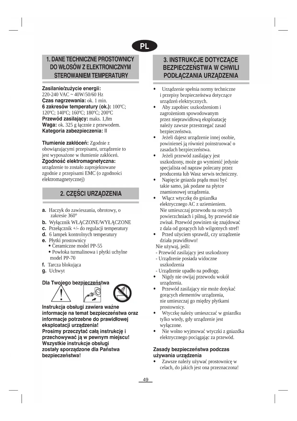 1. DANE TECHNICZNE PROSTOWNICY DO WŁOSÓW Z ELEKTRONICZNYM STEROWANIEM TEMPERATURY Zasilanie/zużycie energii: