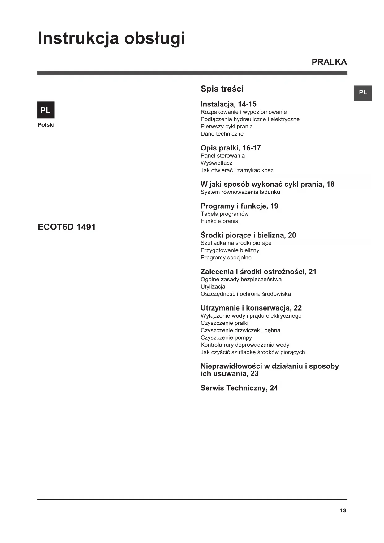 Polski Spis treści Instalacja, 14-15 Rozpakowanie i wypoziomowanie Podłączenia hydrauliczne i elektryczne Pierwszy cykl prania Dane techniczne Opis pralki, 16-17 Panel sterowania Wyświetlacz Jak otwierać i zamykac kosz W jaki sposób wykonać cykl prania, 18 System równoważenia ładunku Programy i funkcje, 19 Tabela programów Funkcje prania Środki piorące i bielizna, 20 Szuadka na środki piorące Przygotowanie bielizny Programy specjalne Zalecenia i środki ostrożności, 21 Ogólne zasady bezpieczeństwa Utylizacja Oszczędność i ochrona środowiska Utrzymanie i konserwacja, 22 Wyłączenie wody i prądu elektrycznego Czyszczenie pralki Czyszczenie drzwiczek i bębna Czyszczenie pompy Kontrola rury doprowadzania wody Jak czyścić szuadkę środków piorących Nieprawidłowości w działaniu i sposoby ich usuwania, 23 Serwis Techniczny, 24