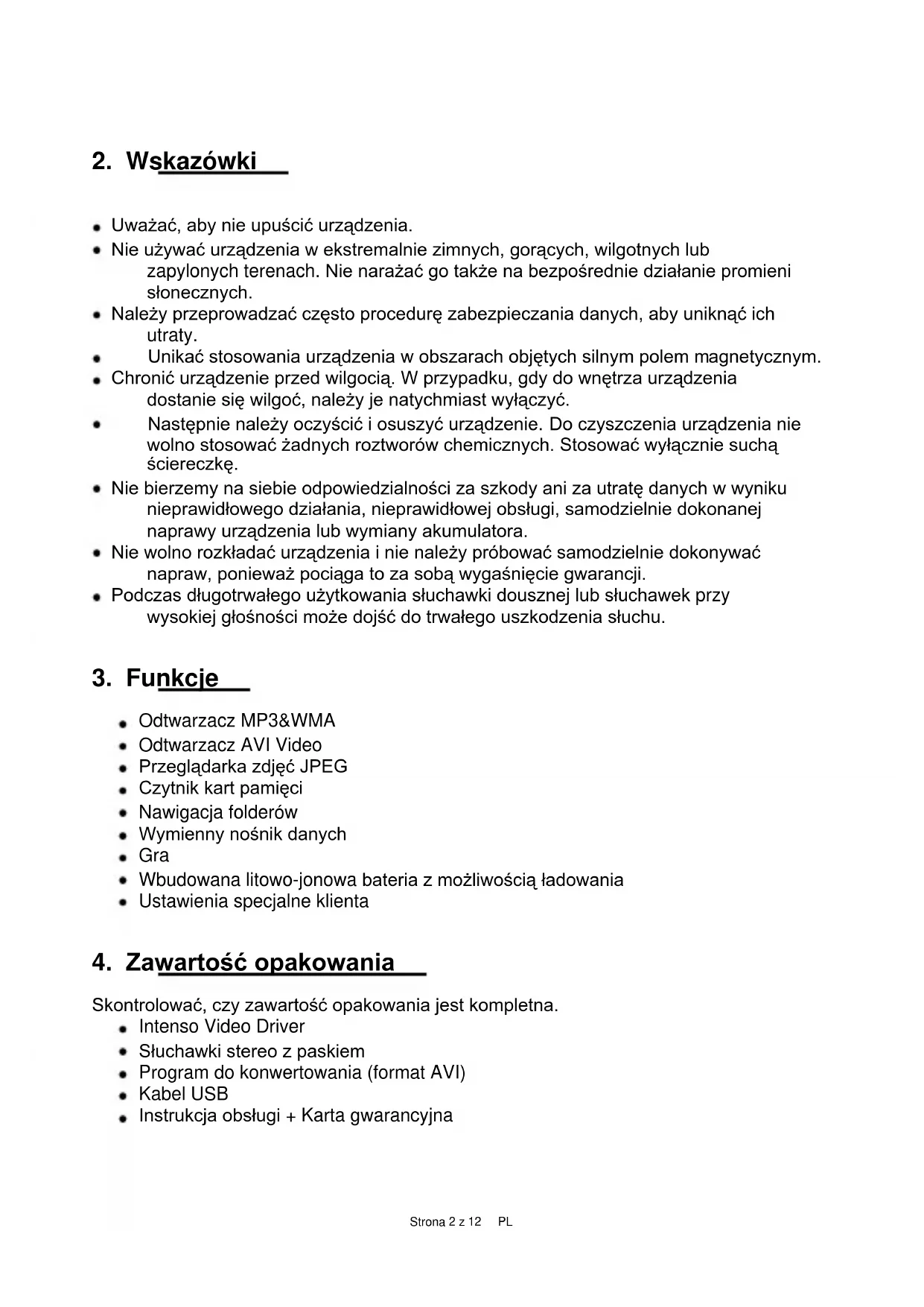 Skontrolować, czy zawartość opakowania jest kompletna. Intenso Video Driver Słuchawki stereo z paskiem Program do konwertowania (format AVI) Kabel USB Instrukcja obsługi + Karta gwarancyjnaStrona 3 z 12 PL