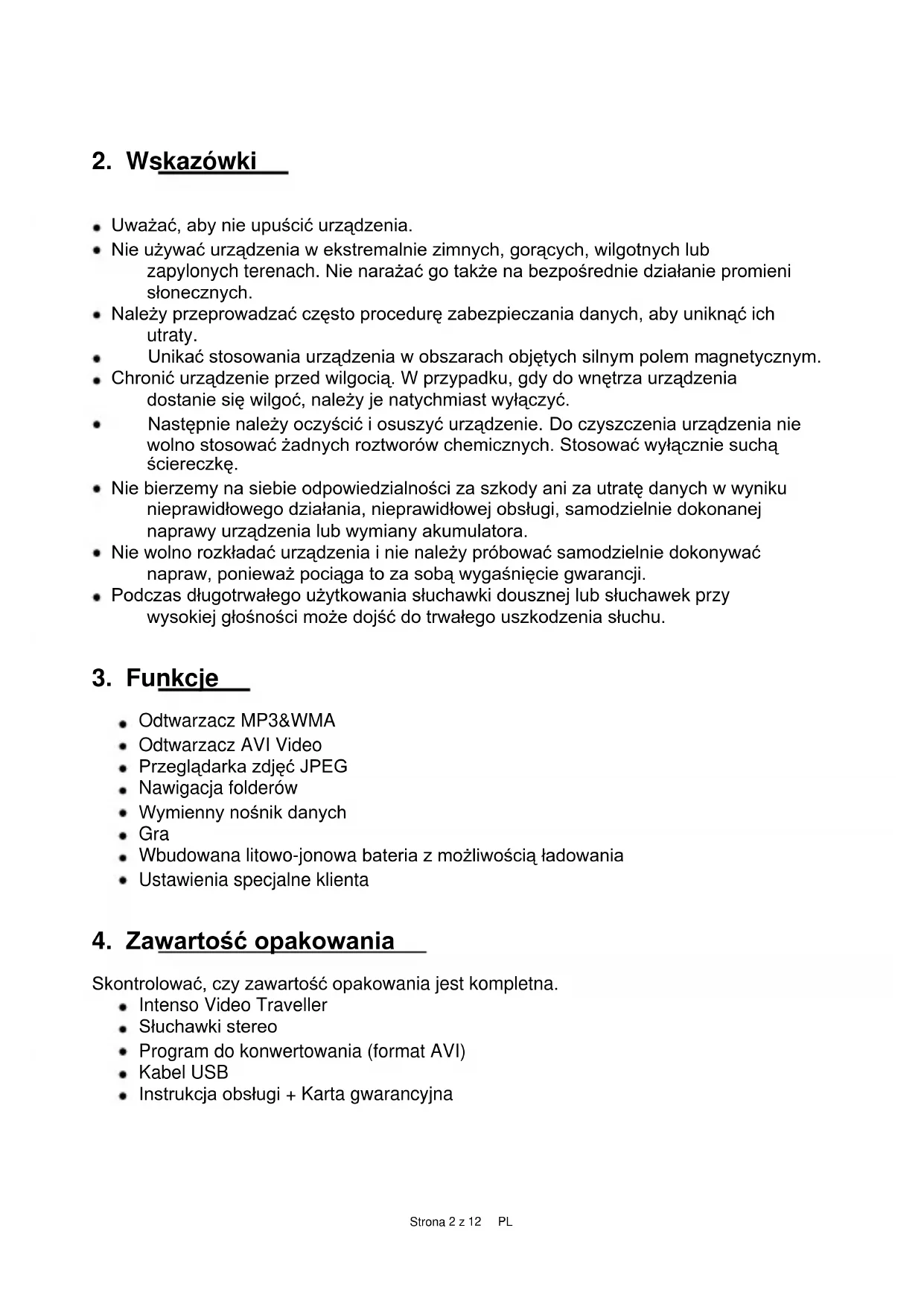 Skontrolować, czy zawartość opakowania jest kompletna. Intenso Video Traveller Słuchawki stereo Program do konwertowania (format AVI) Kabel USB Instrukcja obsługi + Karta gwarancyjnaStrona 3 z 12 PL