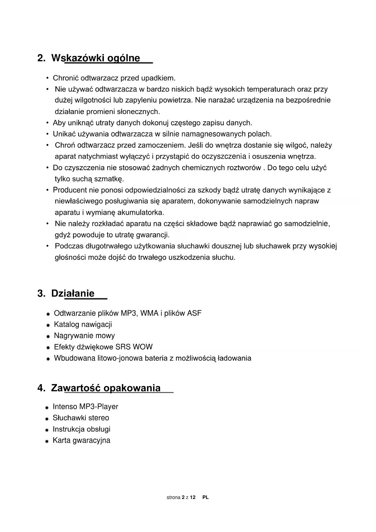 Intenso MP3-Player Słuchawki stereo Instrukcja obsługi Karta gwaracyjnastrona 3 z 12 PL
