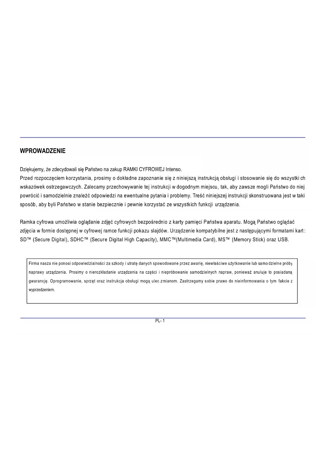 Dlaczego rzeczywista pojemność karty pamięci jest mniejsza niż podana na opakowaniu? Określenie pojemności nośnika pamięci typu Flash odbywa się analogicznie do określenia pojemności w przypadku dysków twardych i podlega wytycznym standardu SI (International System of Standards). Nie posługuje się on systemem dwójkowym, w którym 1024 MB przelicza się na 1gigabajt. Standard SI mierzy w wielokrotnościach 1000, zgodnie z czym na przykład 1000 Megabajtów daje 1 Gigabajt. Z uwagi na te różnice w przeliczeniach dochodzi do rozbieżności w podawanych wartościach pojemności. Dlaczego niektóre obrazy mojej karty pamięci nie są wyświetlane na ramce cyfrowej? Niektóre niezbyt popularne i rozpowszechnione nośniki pamięci nie są kompatybilne z ramką cyfrową. Dlatego też należy używać kompatybilnej karty. Należy też mieć na uwadze, że ramka cyfrowa może wyświetlać tylko zdjęcia z formatem pliku „JPEG” . Włożyłem kartę pamięci. Ramka cyfrowa nie może jej jednak odczytać. Co mam zrobić? Po pierwsze należy sprawdzić, czy karta ta jest kompatybilna z RAMKĄ CYFROWĄ firmy Intenso. Następnie należy sprawdzić, czy karta została włożona do slotu we właściwy sposób. Należy również pamiętać o tym, że ramka cyfrowa obsługuje jedynie format pliku „JPEG”. Uwaga: Niektóre aparaty cyfrowe zapisują zdjęcia w standardowym formacie JPEG. W tym wypadku prosimy o sprawdzenie instrukcji obsługi Państwa aparatu.PL- 22 Dlaczego niektóre zdjęcia ładują się szybciej a niektóre wolniej? Zdjęcia o wyższej rozdzielczości wymagają więcej czasu, aby mogły zostać wyświetlone. Aby zwiększyć prędkość wyświetlania, należy używać zdjęć o niższej rozdzielczości. Uwaga: Ramka cyfrowa na zdjęcia obsługuje rozdzielczość do 8000*8000 pikseli. Dlaczego oprogramowanie nie uruchamia się, pomimo tego, że jest podłączone do prądu a Power (Moc) jest ustawiona na „Włączony”? Prawdopodobnie ma miejsce błąd systemu. Należy ponownie uruchomić oprogramowanie, wyłączając je wcześniej na kilka sekund . Dlaczego na wyświetlaczu nie jest wyświetlane menu główne? Należy sprawdzić, czy ramka cyfrowa jest prawidłowo podłączona do gniazdka a włącznik mocy jest ustawiony na „Włączony”. Czy mogę obracać zdjęcia na wyświetlaczu? Tak, w tym celu należy użyć strzałek [], [] na ramce cyfrowej lub przycisków , znajdujących się na pilocie. Uwaga: Obrócony obraz przy ponownym pokazie jest wyświetlany ponownie w normalnej pozycji.PL- 23 Czy mogę dopasować kolory zdjęć? Nie. Wszystkie ustawienia barw są dokonywane podczas robienia zdjęcia. Można jednak dopasować jasność oraz kontrast wyświetlacza. W jakiej rozdzielczości powinien być obraz, aby można go było optymalnie zaprezentować na wyświetlaczu? Najlepszą rozdzielczością dla ramki cyfrowej jest 800*600 pikseli. Dlaczego funkcje: Automatycznego włączania / wyłączania nie działają, pomimo tego, że zostały aktywowane? Należy upewnić się, czy godzina została prawidłowo ustawiona. Jeżeli ustawiona godzina należy do przeszłości, funkcja ta zost aje po raz pierwszy aktywowana dopiero następnego dnia kalendarzowego. Nie należy przestawiać włącznika na drugiej stronie ramki cyfrowej na pozycję POWER OFF (moc wyłączona). Należy przestawić ramkę cyfrową jedynie w tryb czuwania (Standby).PL- 24 SPECYFIKACJE PRODUKTU Wyświetlacz Cyfrowy TFT LCD Wielkość wyświetlacza: 8” cali Tryb wyświetlania: 4:3 Rozdzielczość: 800*600 pikseli Zasilacz Input: 100~240V AC, 50/60Hz Output: 5V 1A DC Port USB USB Host 2.0 Obsługuje nośniki danych USB Obsługiwane karty pamięci SD™ (Secure Digital Card), MMC™ (MultiMedia Card), MS™ (Memory Stick) Obsługiwane formaty obrazu JPEG, maksymalna rozdzielczość:8000*8000 pikseli Temperatura robocza -10°C ~ +40°C Wymiary 33*184*225 mm Waga 500 gr. Akcesoria Pilot (razem z baterią), stojak, zasilacz sieciowy, instrukcja obsługi w kilku językachPL- 25